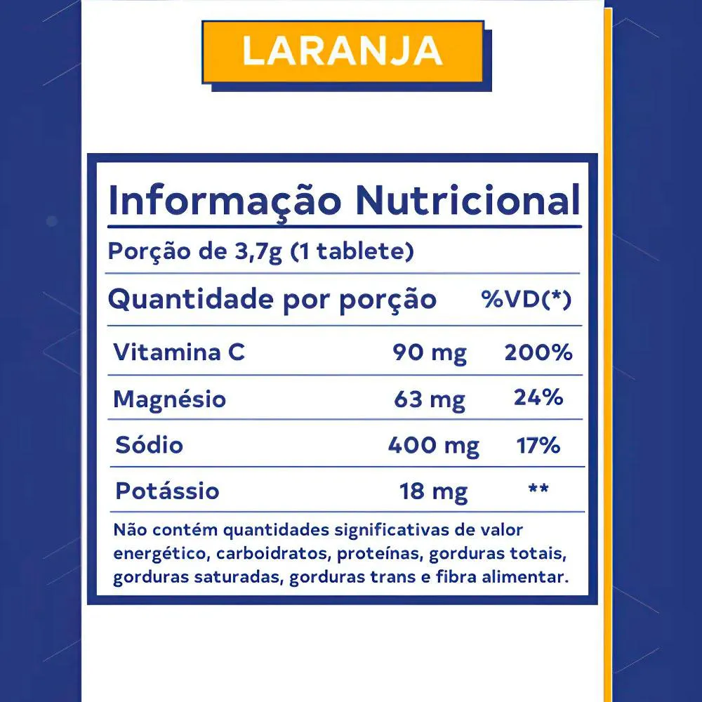 Ingredientes: óxido de magnésio, ácido ascórbico, cloreto de potássio, estabilizantes sorbitol, bicarbonato de sódio e polivinilpirrolidona, acidulantes ácido cítrico e polietileno glicol, aromatizante, antiumectante dióxido de silício, edulcorantes steviol.