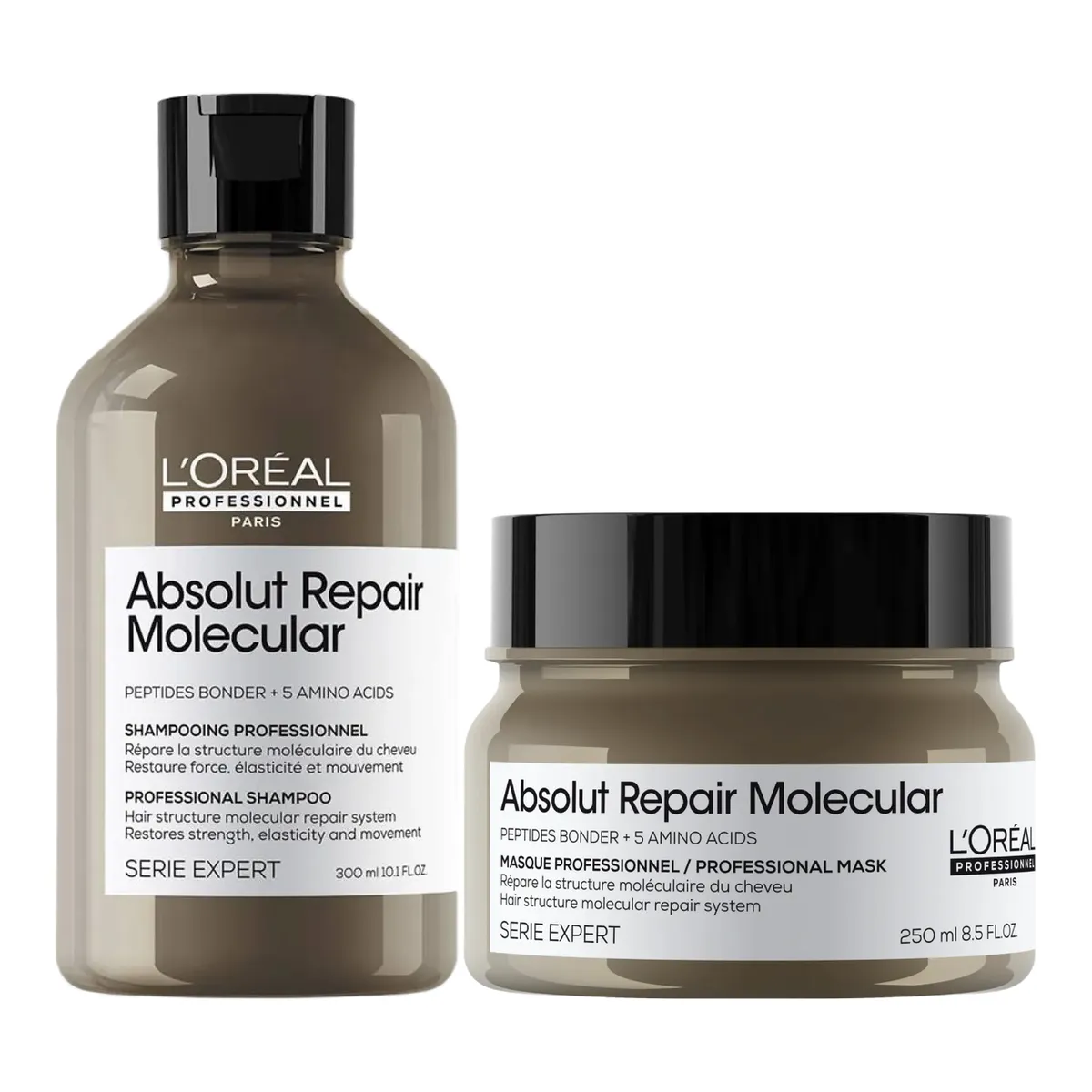 O Kit Absolut Repair Molecular L'Oréal Professionnel Shampoo + Máscara Capilar é um tratamento capilar desenvolvido para cabelos danificados e muito danificados. Sua fórmula atua no interior da fibra capilar, reconstituindo a estrutura molecular dos fios, proporcionando reparação intensa, força e elasticidade. O shampoo é enriquecido com peptídeos + 5 aminoácidos, que penetram profundamente na fibra para reparar danos severos causados por processos químicos, mecânicos ou térmicos. A máscara capilar também é enriquecida com peptídeos e aminoácidos, devolvendo vitalidade a cabelos enfraquecidos.