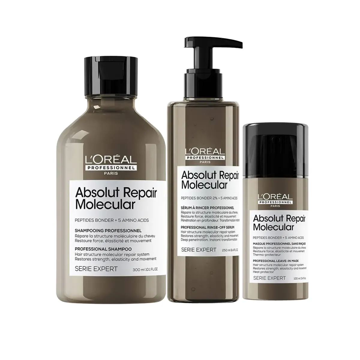 O Kit Absolut Repair Molecular Kit Absolut Repair Molecular L'Oréal Professionnel Shampoo + Sérum Leave-in + Leave-in é um tratamento reparador profundo e instantâneo que atua na reconstrução molecular dos fios, sendo ideal para todos os tipos de cabelos danificados, especialmente os que sofreram agressões químicas, térmicas ou mecânicas. A fórmula avançada contém peptídeos e 5 aminoácidos essenciais que penetram na fibra capilar, reparando danos desde o interior e restaurando a estrutura original da fibra. Com ação termoativada, protege contra o calor de até 230°C, deixando os fios mais fortes, macios, brilhantes e visivelmente saudáveis.