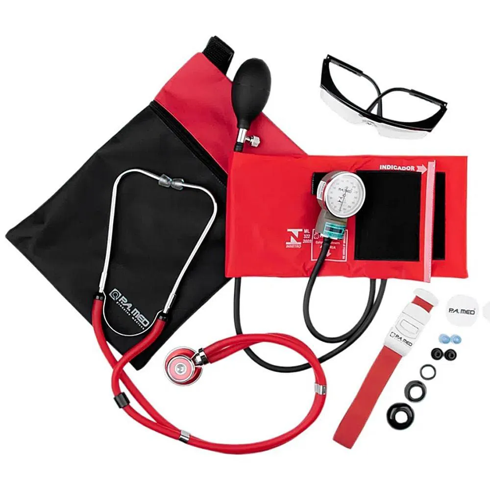 O Kit Acadêmico P.A MED Vermelho vem com 5 peças oferece um excelente custo-beneficio. Produtos de alta qualidade, verificados pelo INMETRO, garantindo qualidade no resultado. Ideal para alunos de enfermagem, medicina, veterinário e para quem deseja ter esses produtos em casa. KIT COMPOSTO POR:- 01 Aparelho de pressão P.A. MED (nylon com fecho de contato).
