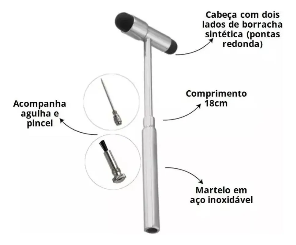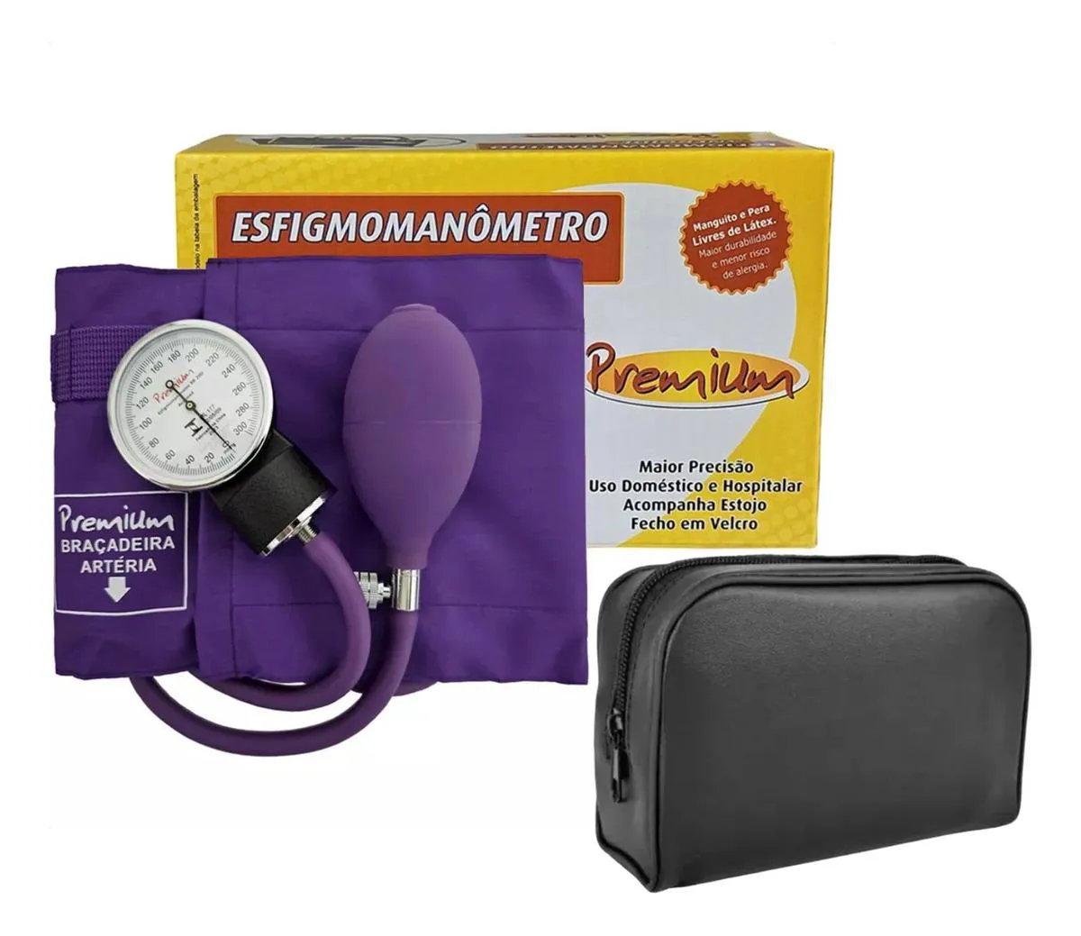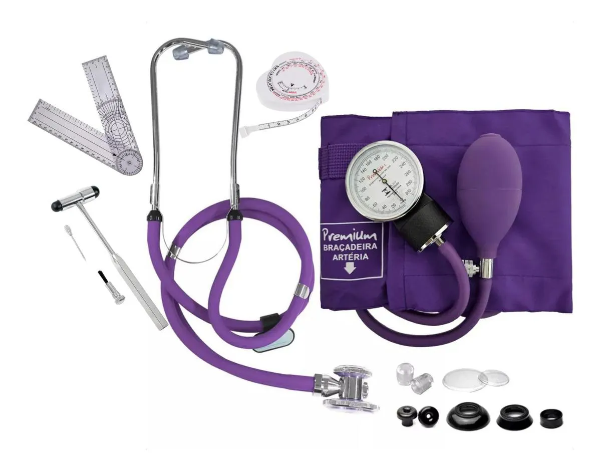 Kit composto por: 01 - Esfigmomanômetro Aneróide Roxo Premium; 01 - Estetoscópio Duplo Roxo Pamed; 01 - Martelo Para Reflexo Buck MD; 01 - Fita Métrica Supermedy; 01 - Goniômetro Grande 36 cm. - ESFIGMOMANOMETRO ANERÓIDE PREMIUM • Fecho de Velcro • Braçadeira em Nylon • Manguito e pera em PVC • Acompanha estojo (bolsa) • Marca: Premium • Circunferência da braçadeira: 18-35 cm (tamanho adulto) • Registro ANVISA: 80275310022 - ESTETOSCÓPIO RAPPAPORT P.A. MED • Tubo duplo para ausculta mais precisa • Atende recém-nascido, pediátrico e adulto • Acompanha kit de acessórios • Registro ANVISA: 80540449002 - MARTELO BUCK • Cabeça com duas pontas de PVC. • Possui agulha e pincel com cerdas armazenados nas extremidades do cabo. • Confeccionado em metal cromado • Dimensões (C x L): 18 x 5 cm • Registro ANVISA: 80070210050 - GONIÔMETRO GRANDE • Mensuração da amplitude de movimento de grandes articulações, tais como, joelho, cotovelo, ombro, entre outras. • Modelo tradicional, composto por duas réguas unidas por um forte rebite, que permite um giro de até 360 graus • Tamanho: 36 cm • Material resistente em PVC - FITA ANTROPOMÉTRICA RETRÁTIL • Com botão de trava pra a fita e retração automática • Formato em coração • Com disco para o cálculo de IMC • Tamanho da fita: 1,5 metros de comprimento • Fita de fibra de vidro inelástica e maleável • Dimensões (C x L x A): 5cm x 5cm x 1cm