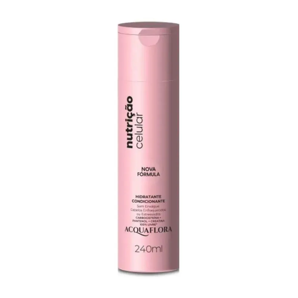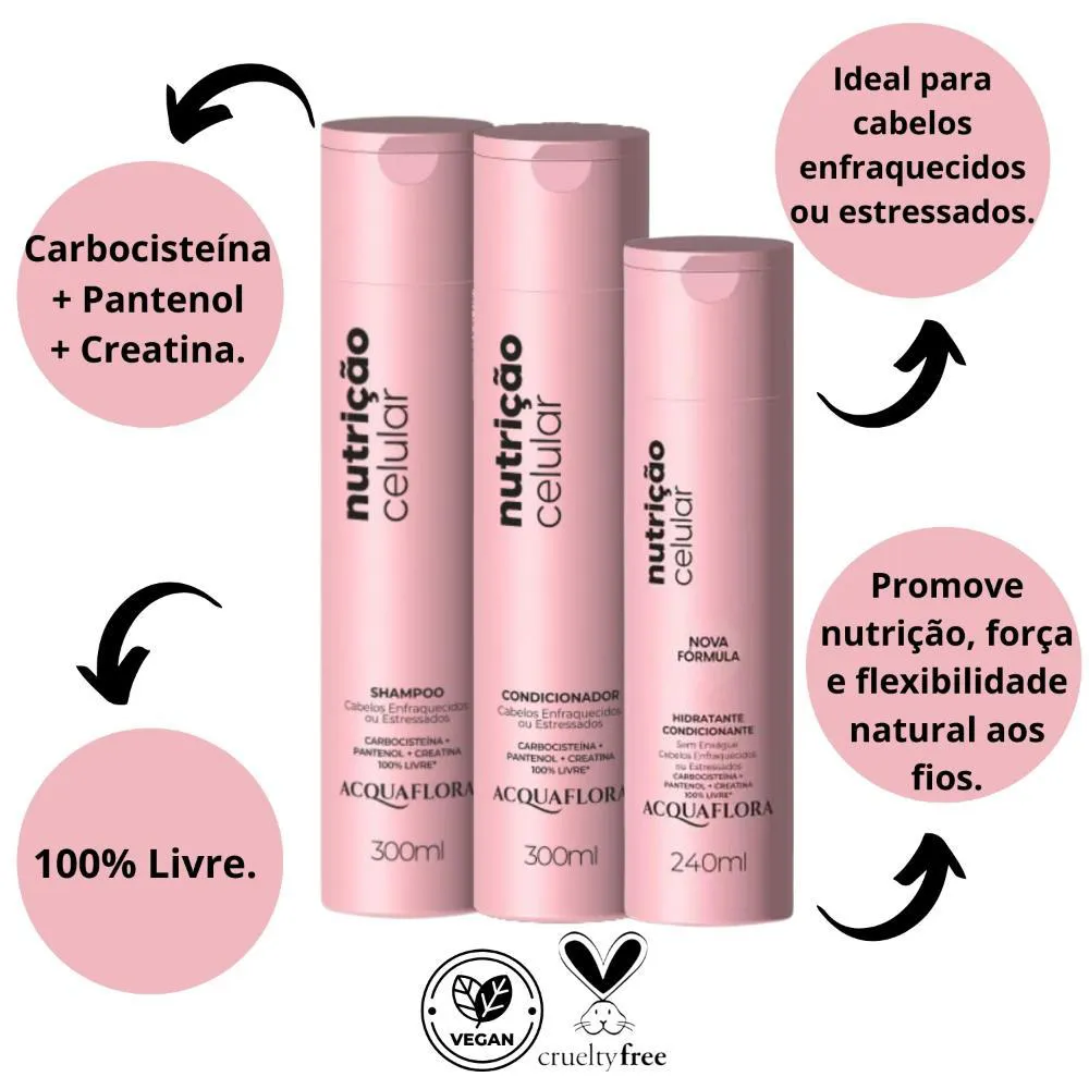 Kit Nutrição Celular Com 4 Contém: - 01 shampoo Acquaflora Nutrição Celular 300ml; - 01 condicionador Acquaflora Nutrição Celular 300ml; - 01 hidratante Condicionante Acquaflora Nutrição Celular 240ml Shampoo O Shampoo Nutrição Celular promove limpeza delicada aos cabelos enfraquecidos ou estressados devido a sobrecarga de produtos químicos e tratamentos térmicos. Fórmula enriquecida com Carbocisteína + Pantenol + Creatina que promovem nutrição, força e flexibilidade natural aos fios, reparando a parte mais interna da fibra capilar, repondo massa perdida e entregando maior resistência. * 100% Livre de: Sal, Parabenos, Óleo mineral, Vaselina e Corantes. Vegano. Sem origem animal. Modo de uso: aplicar o shampoo nos cabelos molhados e massagear suavemente até obter uma espuma cremosa. Enxaguar bem e repetir a operação se necessário. Para um melhor resultado utilize todos os produtos da linha. Condicionador O Condicionador Nutrição Celular condiciona instantaneamente e hidrata os cabelos enfraquecidos ou estressados devido a sobrecarga de produtos químicos e tratamentos térmicos. Sua fórmula é enriquecida com Carbocisteína + Pantenol + Creatina que promovem nutrição, força e flexibilidade natural aos fios, reparando a parte mais interna da fibra capilar, repondo massa perdida e entregando maior resistência. *100% Livre de: Sal, Parabenos, Óleo Mineral, Vaselina e Corantes. Modo de usar: com os cabelos limpos e úmidos, retirar o excesso de água e aplicar o condicionador por toda a extensão dos fios. Massagear suavemente e enxaguar bem. Para um melhor resultado utilize todos os produtos da linha. Hidratante Condicionante Hidrata, desembaraça e elimina o frizz dos cabelos enfraquecidos ou estressados. Finaliza o penteado e protege contra os danos da radiação solar e danos térmicos ocasionados por secadores e pranchas. Fórmula enriquecida com Carbocisteína + Pantenol + Creatinaque promovem nutrição, força e flexibilidade natural aos fios, reparando a parte mais interna da fibra capilar, repondo massa perdida e entregando maior resistência. *100% Livre de: Sal, Parabenos e Corantes. Modo de usar: com os cabelos limpos e úmidos, aplicar uma pequena quantodade de Hidratante por toda a extensão dos fios. Não enxaguar. Secar como de costume. Para um melhor resultado utilize todos os produtos da linha.