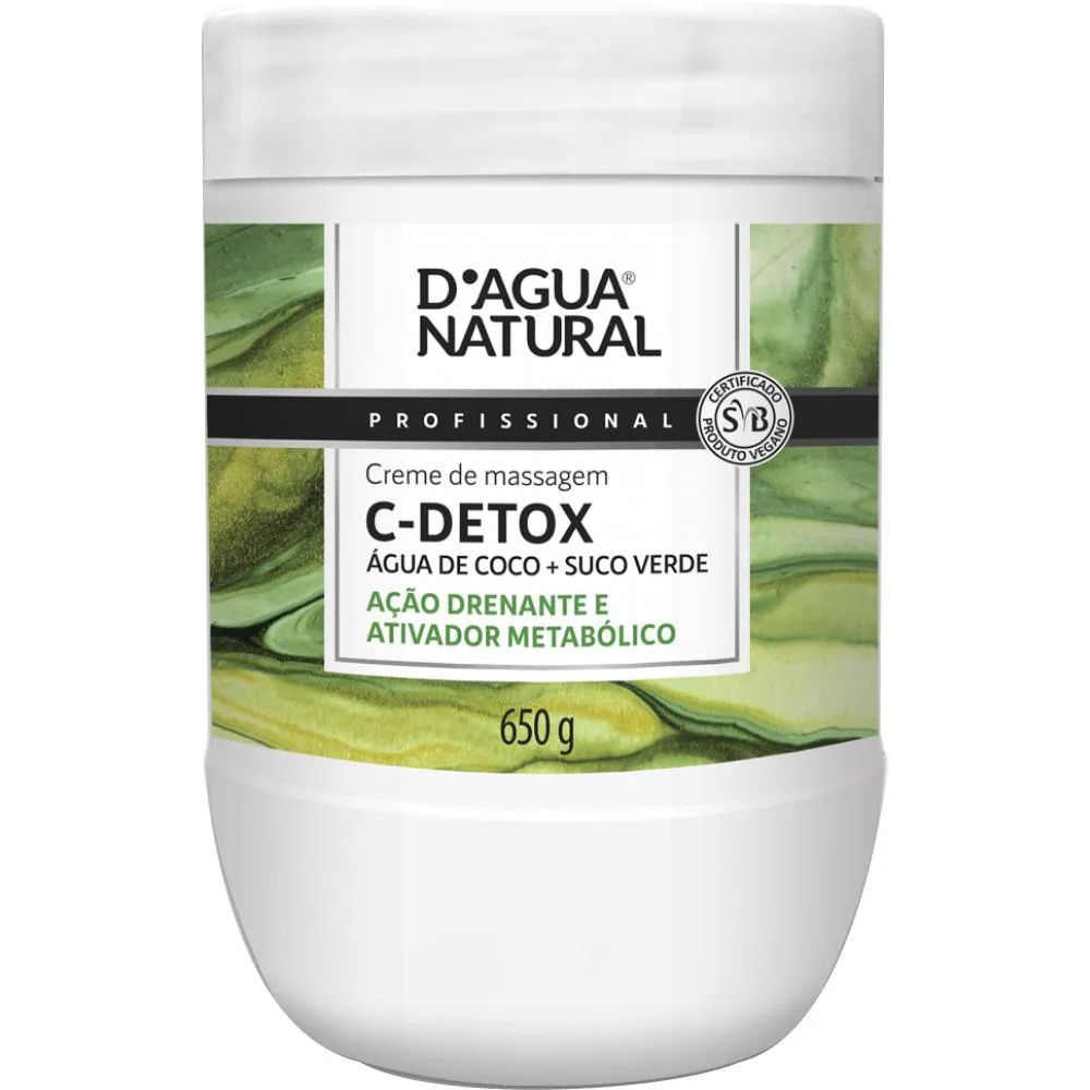 Desenvolvido com exclusivo blend de suco verde e água de coco desidratada, o creme C-DETOX D’agua Natural, possui ação drenante e desintoxicante, além de reforçar o sistema antioxidante da pele. A combinação dos extratos de abacaxi, couve, gengibre e pepino promovem a renovação celular na superfície da pele além de promover a ativação da circulação, devido à sua ação termogênica. A água de coco estimula a eficiência energética das células, atuando por mecanismo Detox mitocondrial proporcionando mais saúde, vitalidade e energia à pele.Deslizamento ideal para massagem. Altamente emoliente. Livre de parabenos.