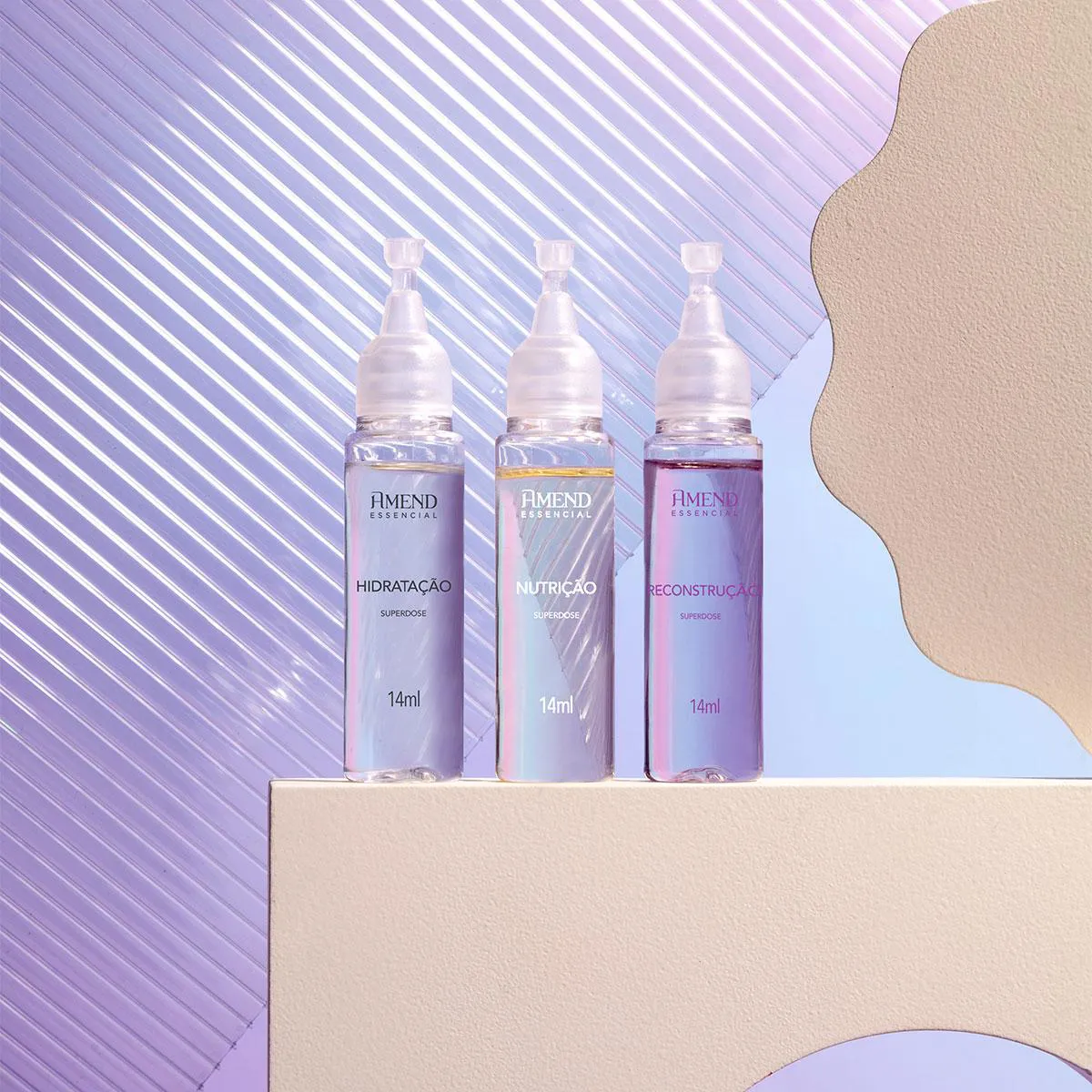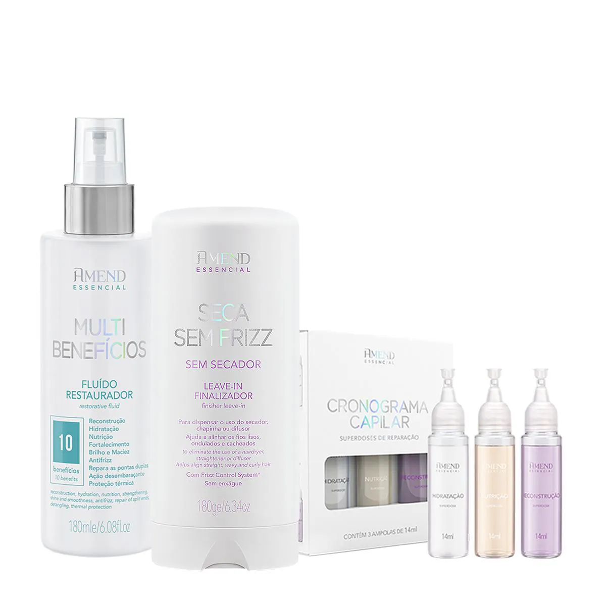 Kit Amend Essencial Cronograma Sem frizz Multibenefícios - Hidratação, Nutrição, Reconstrução e Controle do Frizz Este Kit Contém Amend Seca Sem Frizz - Leave-in Finalizador 180g: reduz o frizz, hidrata profundamente e protege contra calor, deixando os fios macios, leves e alinhados, mesmo sem fonte de calor. Amend Essencial Multibenefícios - Fluido Restaurador 180ml: repõe aminoácidos, fortalece, hidrata e nutre a fibra capilar, garantindo pontas reparadas e brilho intenso. Amend Essencial Superdoses de Reparação Hidratação - Ampola Capilar 14ml: devolve maciez e hidratação imediata para cabelos ressecados. Amend Essencial Superdoses de Reparação Nutrição - Ampola Capilar 14ml: nutre, reduz o frizz, deixando os fios mais sedosos, saudáveis e cheios de vida. Amend Essencial Superdoses de Reparação Reconstrução - Ampola Capilar 14ml: reconstrói as áreas danificadas, fortalece contra quebra, restaura elasticidade e resistência dos fios.