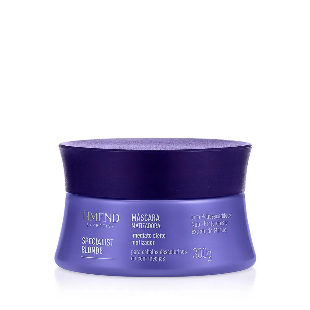 Máscara Matizadora Amend Expertise Specialist Blonde 300g -Imediato efeito matizador;• Ação antioxidante e antirradicais livres;• Neutraliza tons amarelados ou alaranjados;• Reconstrução dos fios danificados;• Elasticidade, maciez e luminosidade.