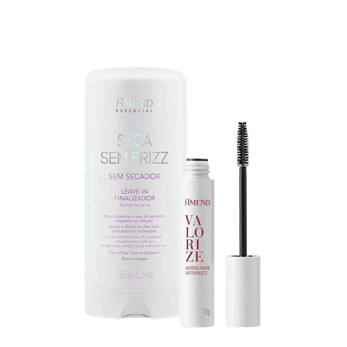 Kit Amend Seca Sem frizz Valorize - Fios Alinhados, Fortalecidos e Modelados Este Kit Contém Amend Seca Sem Frizz - Leave-in Finalizador 180g: reduz o frizz sem pesar, restaura a umidade e repara cutículas. Protege do calor, fortalece e garante fios leves, macios e brilhosos, tanto em secagem ao natural ou com ferramentas. Amend Valorize - Modelador Antifrizz 15g: ação imediata contra arrepiados, alinha os fios e hidrata com toque leve. Com frizz fix e d-pantenol, oferece fixação suave e defesa contra umidade para acabamento duradouro.