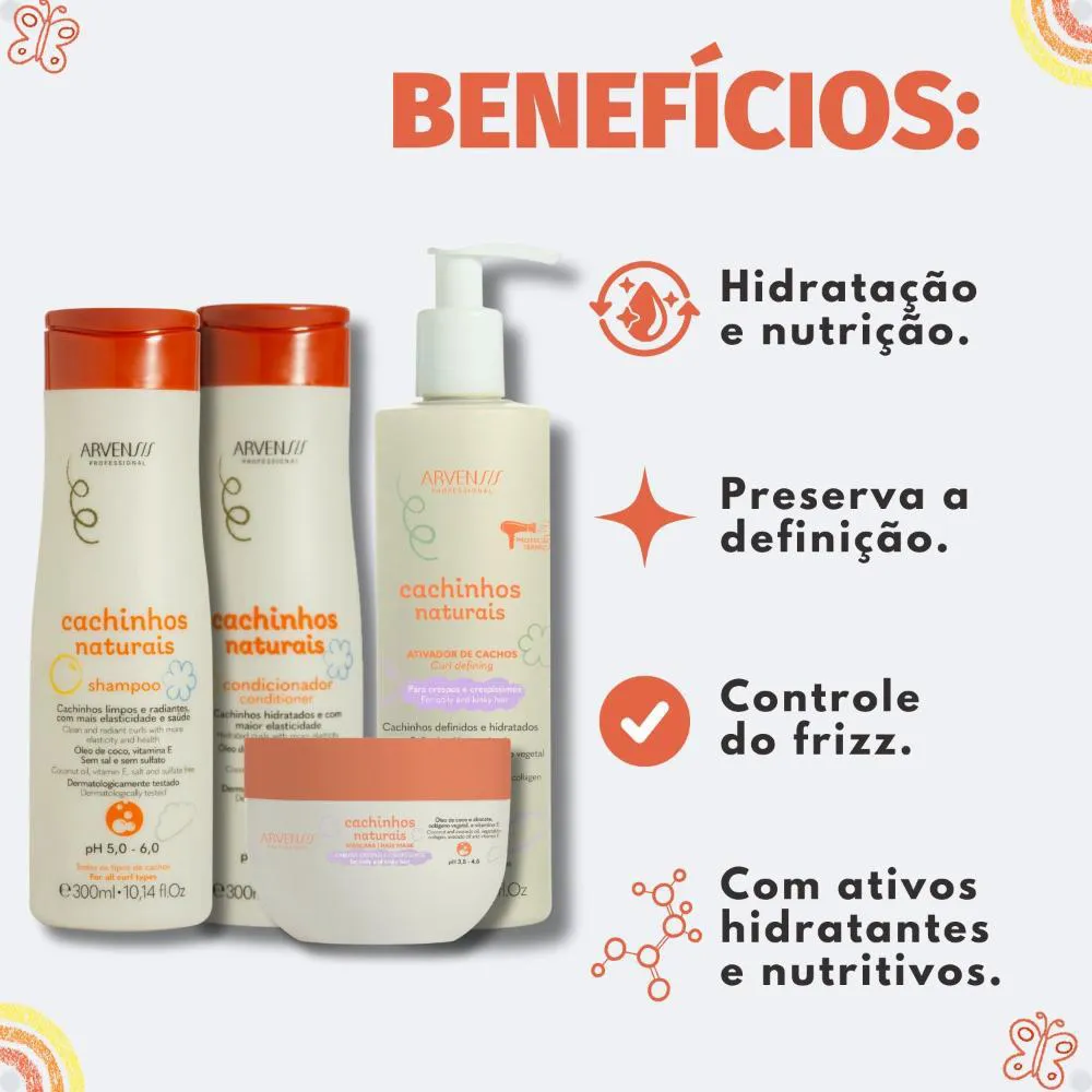 Kit Arvensis Cachinhos Naturais Cabelos Crespos e Crespíssimos: Shampoo 300Ml, Condicionador 300Ml, Máscara 250G e Ativador de Cachos 300Ml