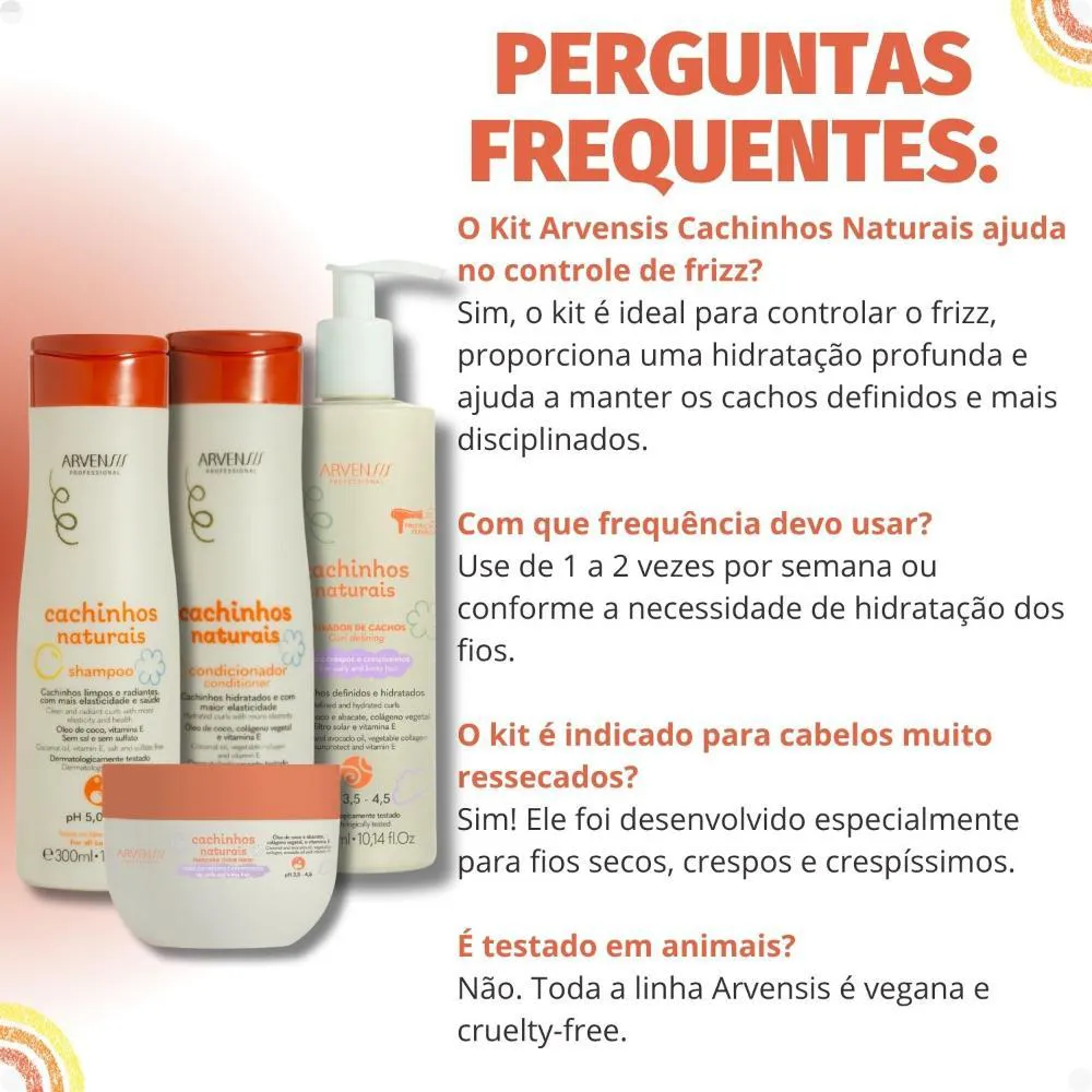 Contém: 01 shampoo Arvensis Cachinhos Naturais 300ml 01 condicionador Arvensis Cachinhos Naturais 300ml 01 Máscara Arvensis Cachinhos Naturais Cabelos Crespos e Crespíssimos 250g 01 Ativador de Cachos Arvensis Cachinhos Naturais Cabelos Crespos e Crespíssimos 300ml . O Kit Arvensis Cachinhos Naturais foi desenvolvido especialmente para cabelos crespos e crespíssimos, proporcionando um cuidado completo que garante cachos saudáveis, definidos e sem frizz. Composto por Shampoo 300ml, Condicionador 300ml, Máscara 250g e Ativador de Cachos 300ml, o kit oferece hidratação profunda, nutrição intensa e definição prolongada. O Shampoo 300ml limpa suavemente os fios, removendo as impurezas sem agredir a fibra capilar, enquanto prepara o cabelo para receber os benefícios do condicionador e da máscara. O Condicionador 300ml ajuda a desembaraçar e nutrir os fios, deixando-os macios, com brilho e mais fáceis de pentear. A Máscara 250g oferece uma hidratação intensa, restaurando a umidade essencial dos fios, deixando os cachos mais definidos e com toque sedoso. Por fim, o Ativador de Cachos 300ml é ideal para modelar os fios, proporcionando cachos volumosos, naturais e com controle de frizz. Esse kit é perfeito para quem busca cachos bem cuidados, definidos e cheios de vida, com um toque de leveza e movimento. . Modo de Uso Aplique o shampoo nos cabelos úmidos, massageando o couro cabeludo e os fios de forma suave. Enxágue bem e, se necessário, repita o processo. Após enxaguar o shampoo, aplique o condicionador nos cabelos ainda úmidos, distribuindo uniformemente do comprimento às pontas. Deixe agir por alguns minutos e enxágue bem. Em seguida, aplique a máscara nos cabelos limpos e úmidos, evitando a raiz. Deixe agir de 10 a 15 minutos para um tratamento mais profundo e enxágue completamente. Com os cabelos ainda úmidos, aplique o ativador de cachos diretamente nos fios, distribuindo uniformemente. Modele os cachos com as mãos ou com um difusor, para garantir mais definição e volume. . Perguntas Frequentes Posso usar o kit em cabelos quimicamente tratados? Sim, o kit pode ser usado em cabelos quimicamente tratados, como alisados ou com outras químicas. Ele ajuda a manter a hidratação e definição dos fios naturais ou tratados. Qual a função do Ativador de Cachos? O Ativador de Cachos 300ml é ideal para dar forma, volume e definição aos cachos, deixando-os mais definidos e com menos frizz. Ele ajuda a modelar os fios, proporcionando cachos soltos e naturais. A máscara pode ser usada em toda lavagem? Para um tratamento mais intensivo, a Máscara 250g pode ser usada 1 a 2 vezes por semana, ou sempre que seus fios precisarem de hidratação profunda. Não é necessário usá-la em todas as lavagens, já que o shampoo e o condicionador já oferecem nutrição. Preciso usar todos os produtos juntos para obter resultados? Para um cuidado completo e melhores resultados, é recomendado usar todos os produtos do kit, pois eles trabalham em conjunto para promover hidratação, nutrição e definição. No entanto, o Shampoo e o Condicionador podem ser usados separadamente se necessário. Os produtos são adequados para cabelos com caspa ou dermatite? O Kit Arvensis Cachinhos Naturais é focado em hidratação e definição, e não contém ativos específicos para tratar caspa ou dermatite. Se você tem condições como essas, é recomendável consultar um dermatologista para saber se esses produtos são adequados para o seu tipo de couro cabeludo. . Código de Registro Sanitário(ANVISA) Shampoo: 25351.555978/2019-73 Condicionador: 25351.562029/2019-40 Máscara: 25351.574123/2019-41 Ativador de Cachos: 25351.574050/2019-98