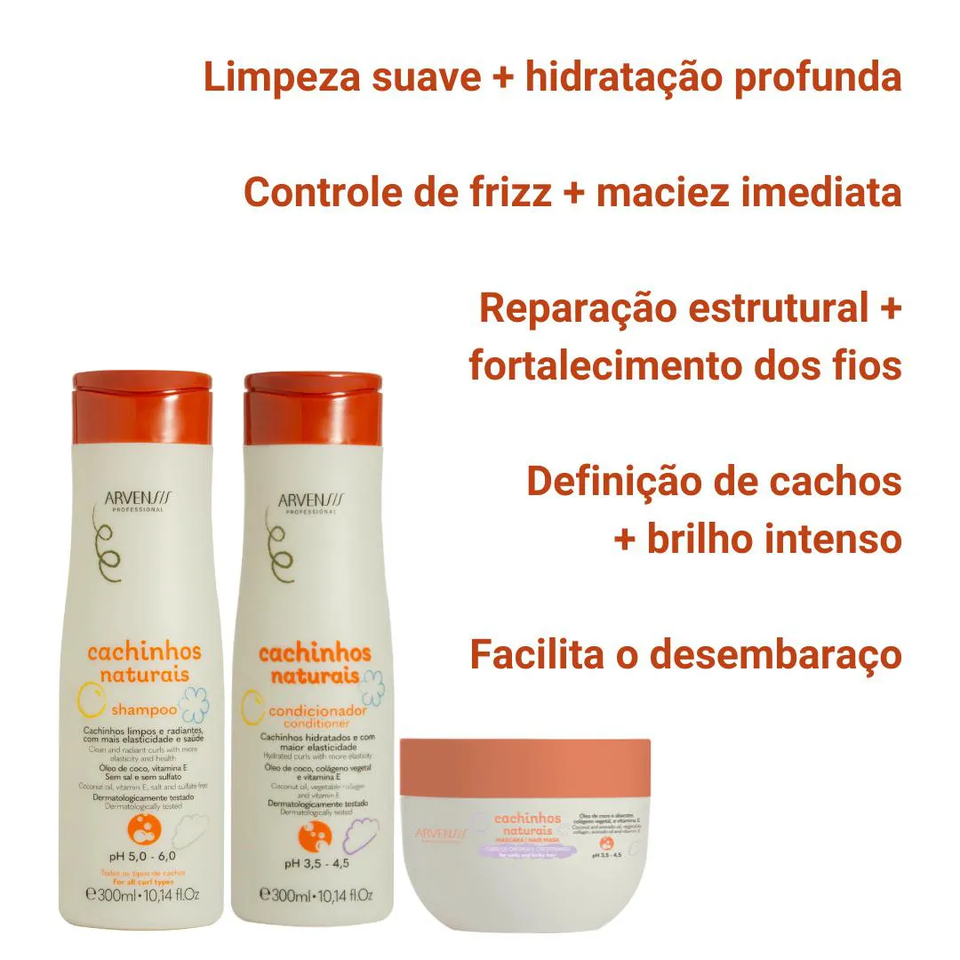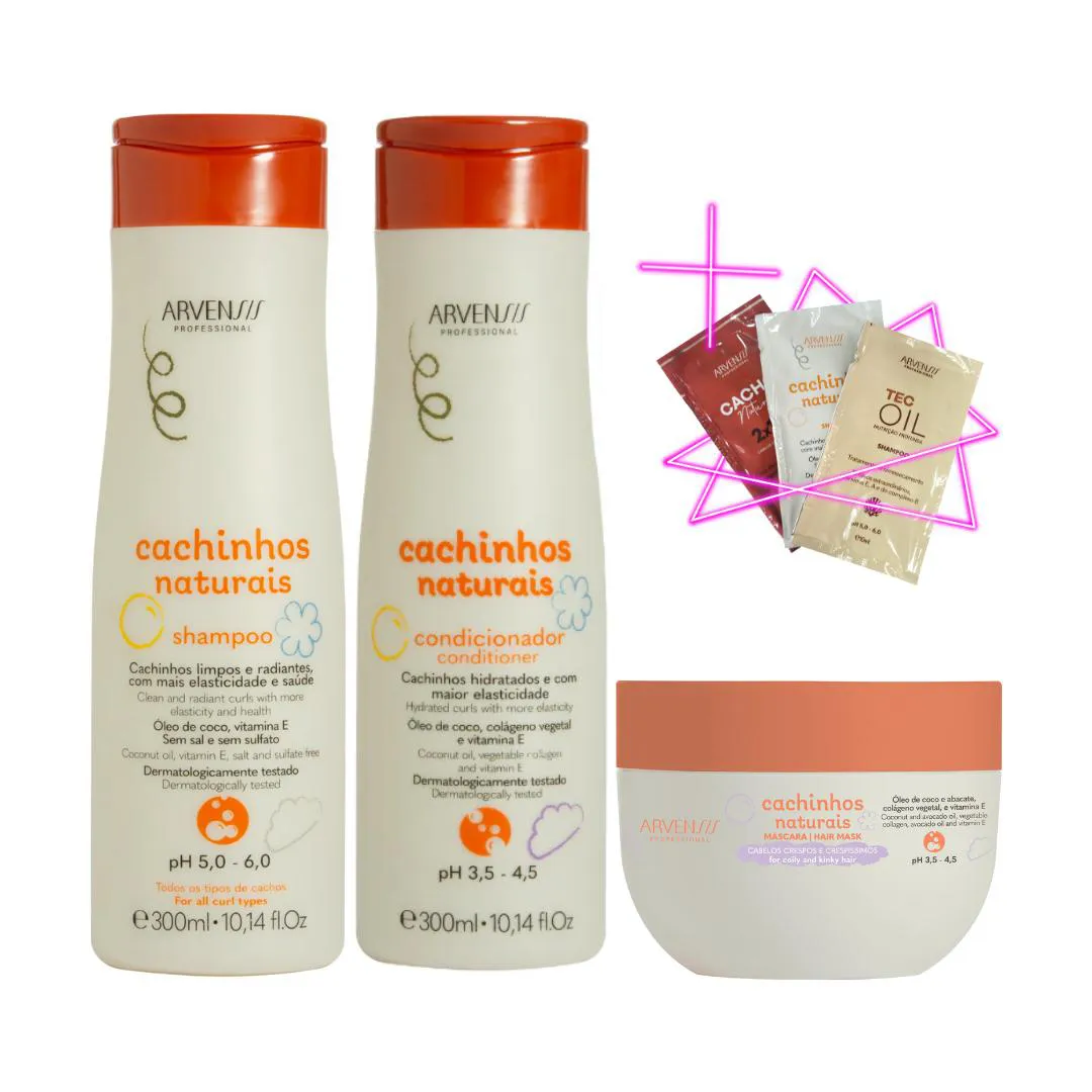 DESCUBRA O KIT PERFEITO PARA CACHOS RADIANTES, MACIOS E SEM frizz! Apresentamos o Kit Completo Arvensis Cachinhos Naturais, desenvolvido para transformar seus cachos e ondinhas com cuidado especializado! O shampoo limpa profundamente sem agredir, graças à sua fórmula livre de sulfato e sal, enquanto devolve a umidade natural e proporciona brilho imediato. O condicionador entra em ação com nutrição avançada, reparando danos e garantindo maciez e controle efetivo do frizz, além de facilitar o desembaraço e fortalecer cada fio. Por fim, a Máscara de Hidratação Intensa penetra nas mechas crespas ou crespíssimas (dos tipos 3B ao 5A), recuperando a elasticidade, definindo os cachos sem ressecamento e selando o brilho com sua poderosa combinação de óleo de coco, abacate e colágeno vegetal. Juntos, eles formam uma rotina irresistível para cachos saudáveis, definidos e cheios de vida! "Meus cachos nunca ficaram tão definidos e macios, amo demais esse kit tudoooo!!" ~Luana S. "O frizz sumiu completamente e as mechas tão hidratadas q parece seda, perfeito demaisss!!" ~Carolina F. "Minha filha adorou, os cachinhos dela tão super fortes e cheirosos, recomendo pra todas!!" ~Patrícia M. - Fórmulas Livres de: Sulfato e Sal (Shampoo)