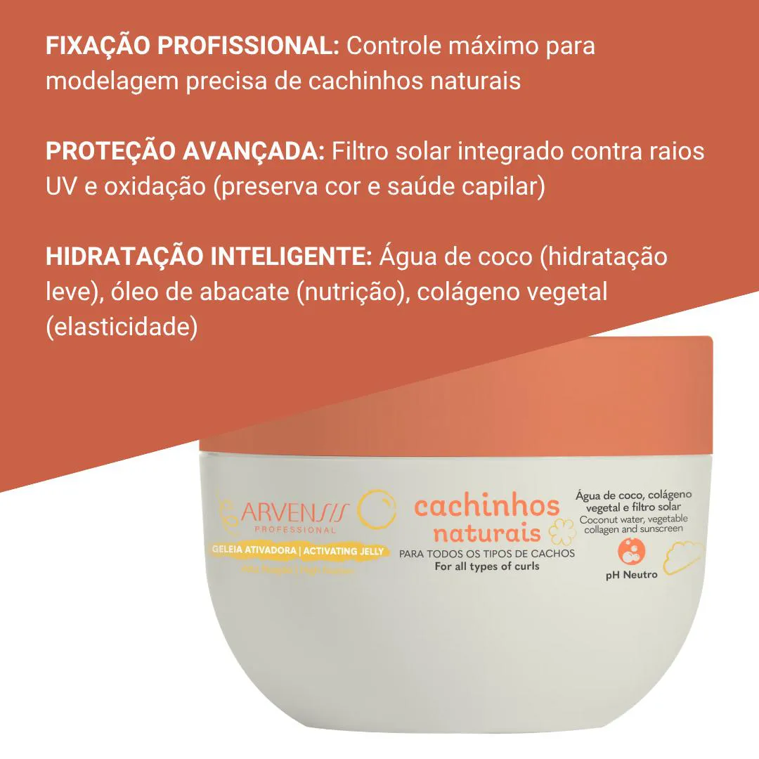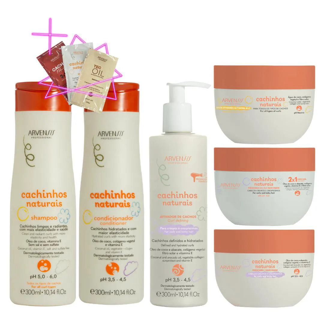 O Kit Arvensis Cachinhos Naturais Crespos e Crespíssimos traz uma rotina completa de tratamento e finalização para cabelos infantis com curvaturas 3B, 3C, 4A, 4B e 4C. Formulado com ativos poderosos como Óleo de Coco, colágeno Vegetal e Abacate, cada produto oferece benefícios que vão desde a limpeza suave até a definição duradoura dos cachos, sempre mantendo a hidratação e nutrição necessárias para fios saudáveis e radiantes.
