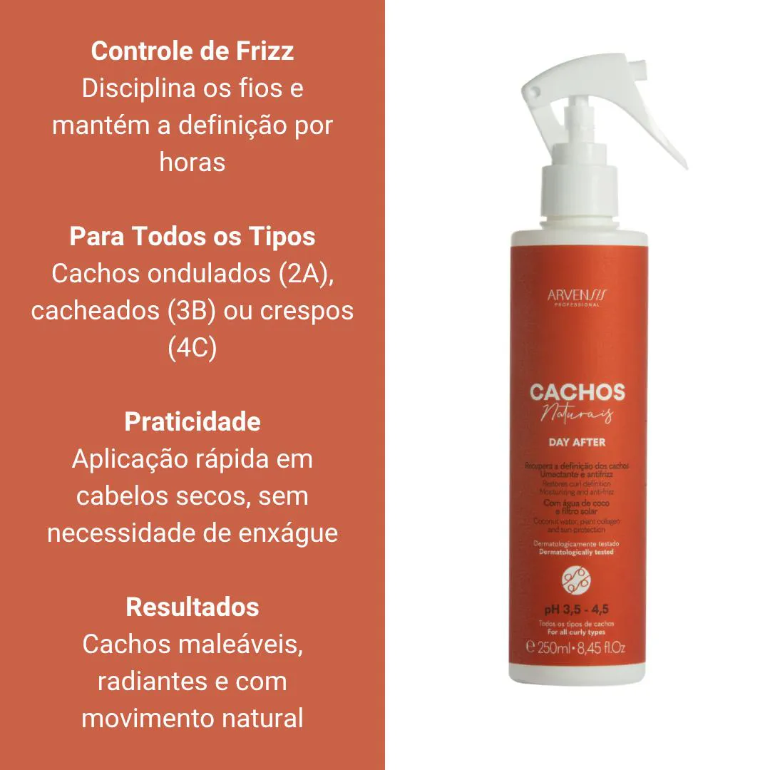 CACHOS PERFEITOS DO banho AO DIA SEGUINTE! Transforme sua rotina capilar com o Kit Duo Arvensis Cachos Naturais! O Co-Wash oferece limpeza inteligente: remove impurezas sem agredir seu couro cabeludo, preservando a oleosidade natural e evitando o efeito rebote. Enriquecido com Óleo de Coco, colágeno Vegetal e vitamina e, nutre profundamente enquanto controla o frizz, deixando seus cachos macios, elásticos e definidos - perfeito para todos os tipos, das ondas 2A aos cachos 4C! Já o spray Day After é seu aliado pós-sono: reativa cachos amassados em segundos com água de coco e colágeno vegetal! Com Filtro Solar integrado, bloqueia raios UV e previne a oxidação, enquanto sua fórmula umectante combate o ressecamento e devolve o brilho. Aplicado em cabelos secos (sem enxágue!), disciplina o frizz e garante definição prolongada com movimento natural - ideal para onduladas 2A, cacheadas 3B ou crespas 4C! "Minhas mechas nunca tão macias e sem frizz, o co-wash mudou tudoooo!!" ~Juliana P.