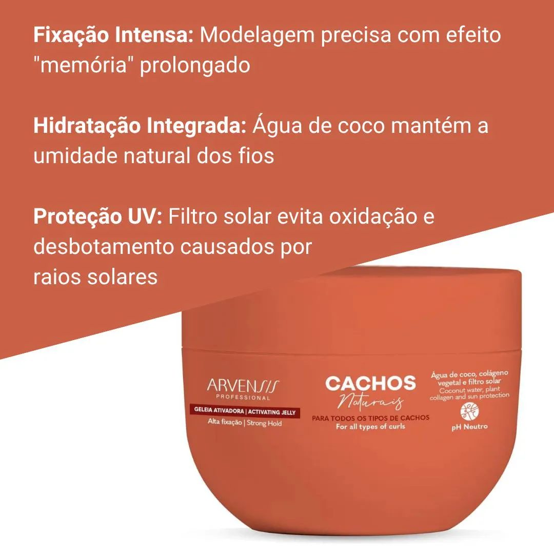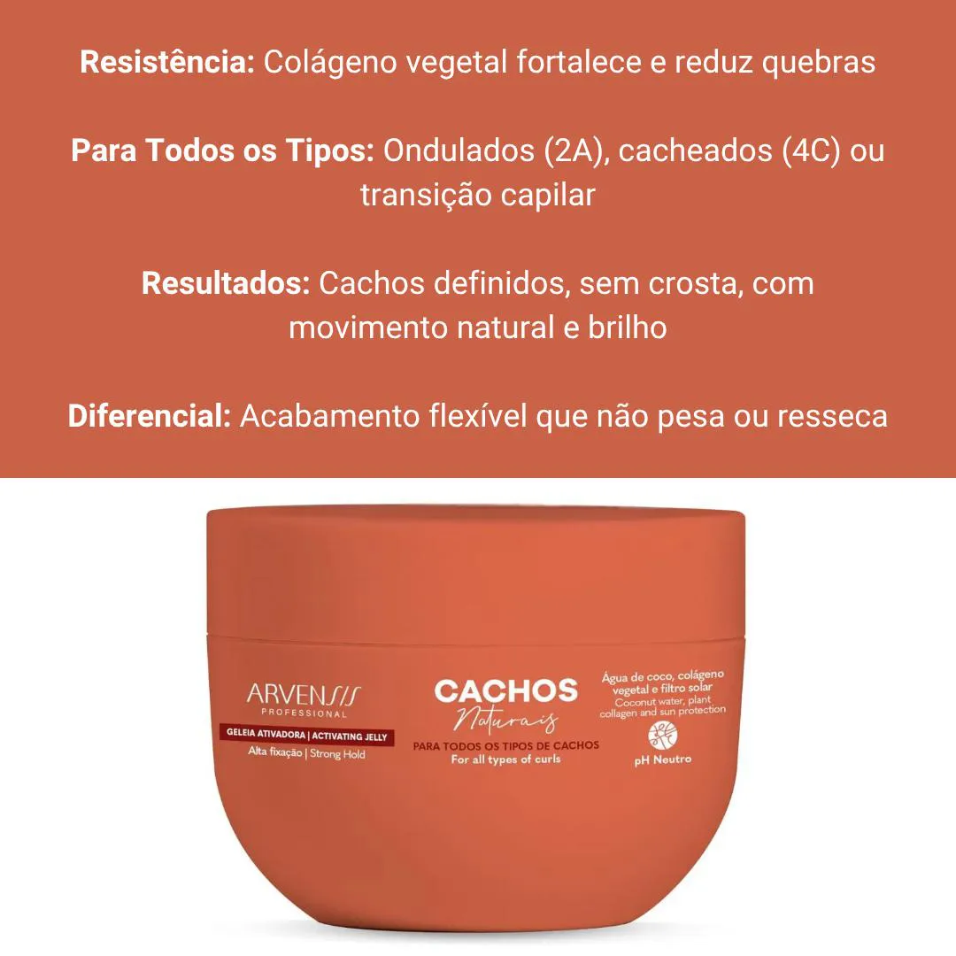 DEFINIÇÃO PERFEITA + FIXAÇÃO INTENSA PARA CACHOS RADIANTES DO DIA À NOITE! Domine a arte dos cachos impecáveis com o Kit Arvensis de Definição Profissional! O Ativador para Cabelos Crespíssimos (3B-5A) é seu segredo para cachos com efeito memória e elasticidade surpreendente: sua fórmula com óleo de coco e abacate nutre profundamente enquanto o colágeno vegetal fortalece cada fio, reduzindo quebras. Com proteção UV e blindagem térmica, seus cachos ficam livres de oxidação mesmo usando secador! Já a Geleia Ativadora de Fixação Alta é ideal para todos os tipos (2A a 4C e transição capilar): oferece modelagem precisa com acabamento flexível, sem crosta ou peso, graças à água de coco que mantém a hidratação natural e ao filtro solar que previne desbotamento. Unidos, eles garantem definição duradoura, movimento natural e brilho intenso - praticidade sem enxágue para resultados de salão! "Meus cachos nunca ficaram tão definidos e sem quebra, o ativador é tudoooo de bom!" ~Camila R.