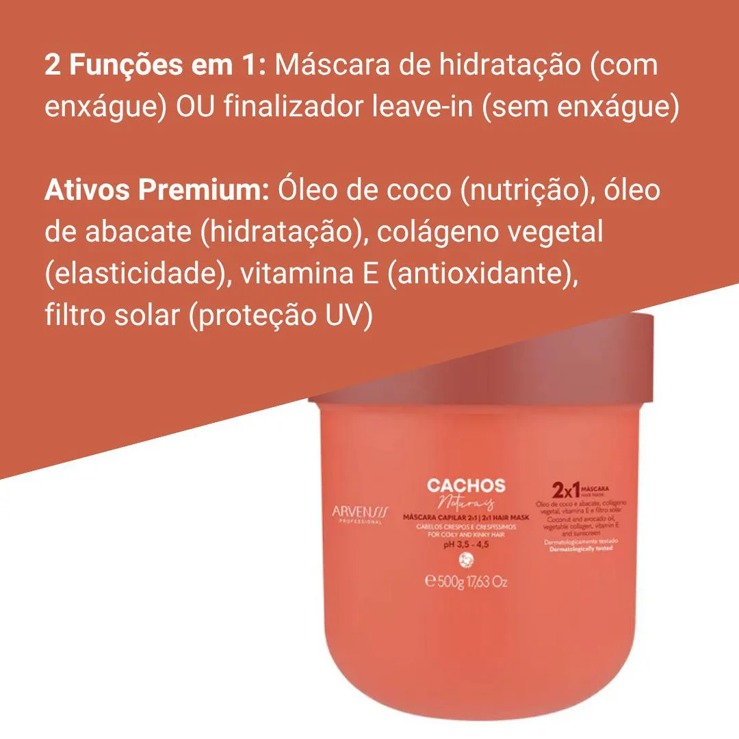O Kit Arvensis Cachos Máscara 2x1, Geleia Alta e escova Caracol oferece um cuidado completo para cabelos crespos e crespíssimos, unindo hidratação profunda, definição duradoura e proteção avançada em dois produtos indispensáveis.