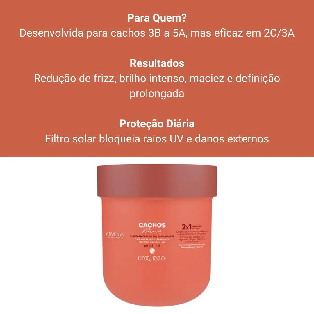 Ideal para cabelos com curvaturas de 3B a 5A, este kit é a escolha perfeita para quem quer cachos definidos, hidratados e sempre prontos para brilhar.