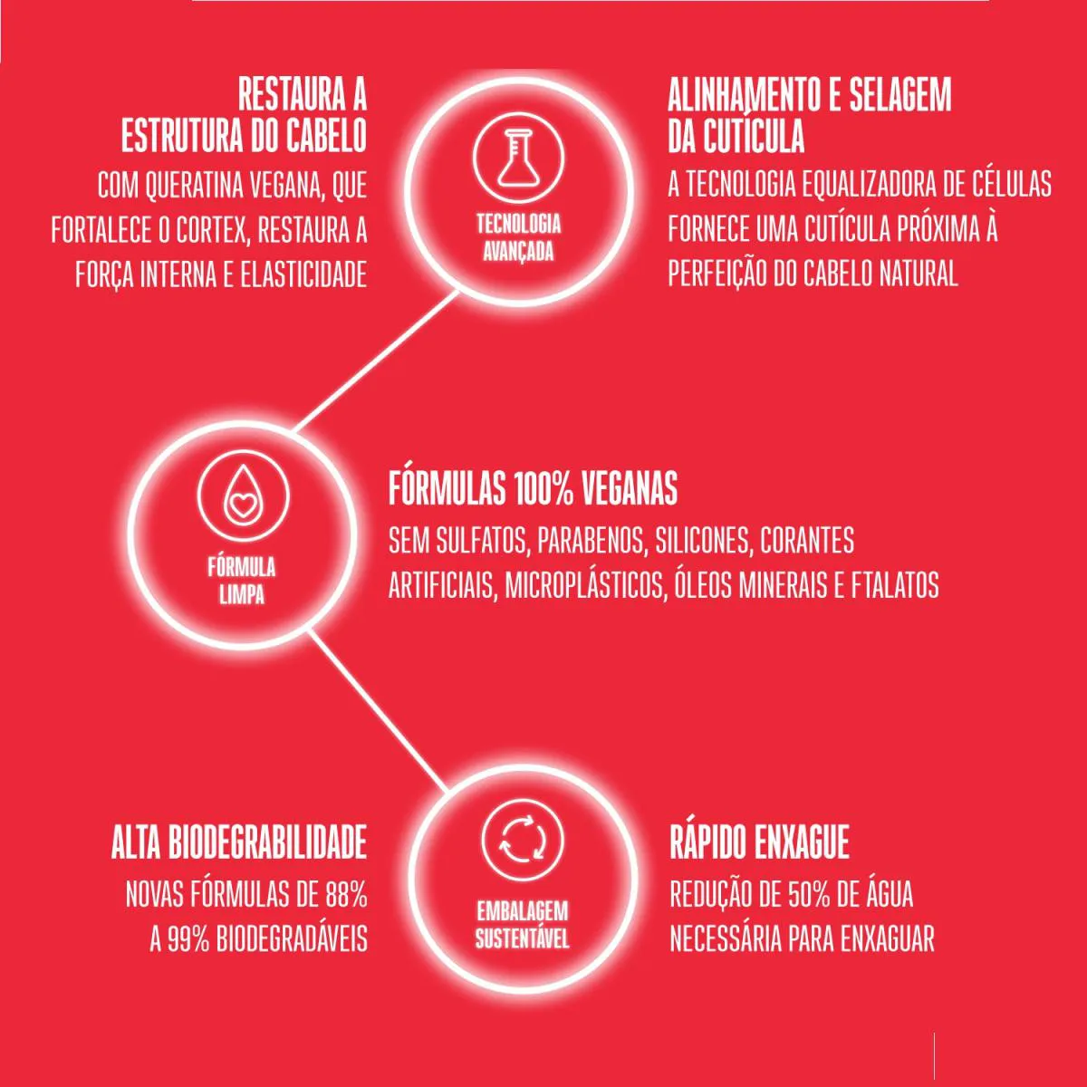 - Máscara 200g: Repara profundamente os danos, fortalece a fibra capilar e devolve o brilho natural.