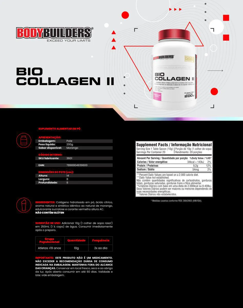 Bio Collagen BodybuildersDesempenha um papel no fortalecimento da pele, além de poder beneficiar a elasticidade e a hidratação. Com a idade, seu corpo produz menos colágeno, levando à pele seca e à formação de rugas. No entanto, vários estudos demonstraram que peptídeos de colágeno ou suplementos contendo colágeno podem ajudar a retardar o envelhecimento da pele, reduzindo rugas e ressecamento. BENEFÍCIOS: