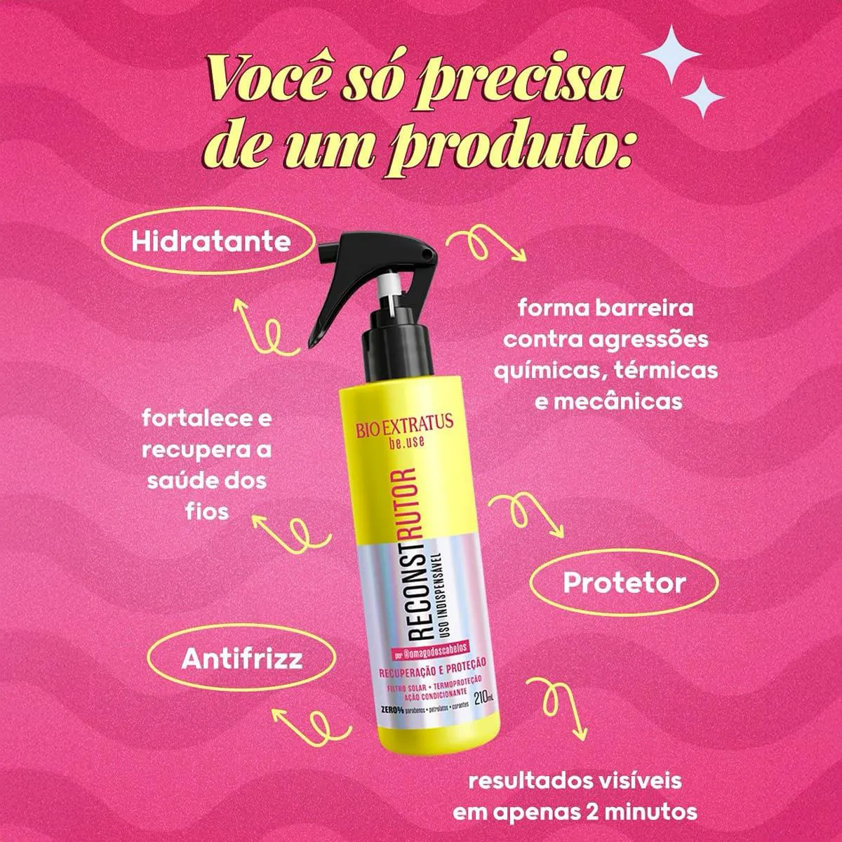 Tratamento: como tratamento reconstrutor, com os fios limpos, borrife em toda a extensão dos fios, massageando suavemente. Deixe agir 2 minutos e enxágue. Pode usar antes ou depois da máscara. Como finalizador, com cabelos limpos e úmidos, borrife em toda a extensão dos fios. Não enxágue. Finalize como desejar.