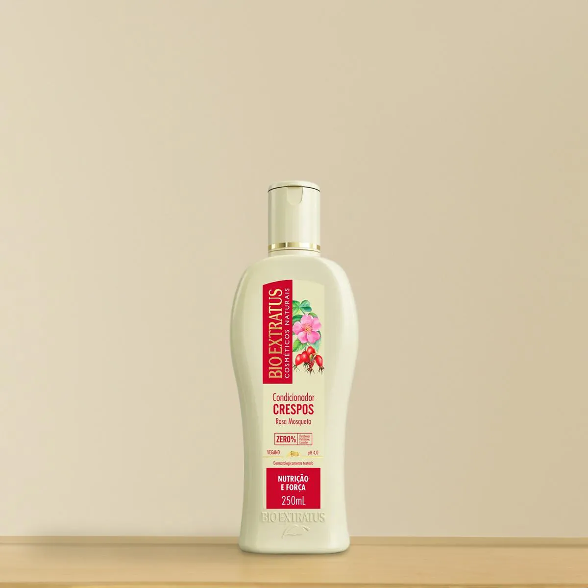 Bio Extratus Crespos Rosa Mosqueta - condicionador 250ml: condiciona, nutre e fortalece a fibra capilar, deixando o cabelo mais resistente e macio. Enriquecido com rosa mosqueta e óleo de abacate, conta com pH4, tratando os fios em perfeita sinergia, unindo sua força nutritiva e reparadora. Sem parabenos, petrolatos, corante e sal.