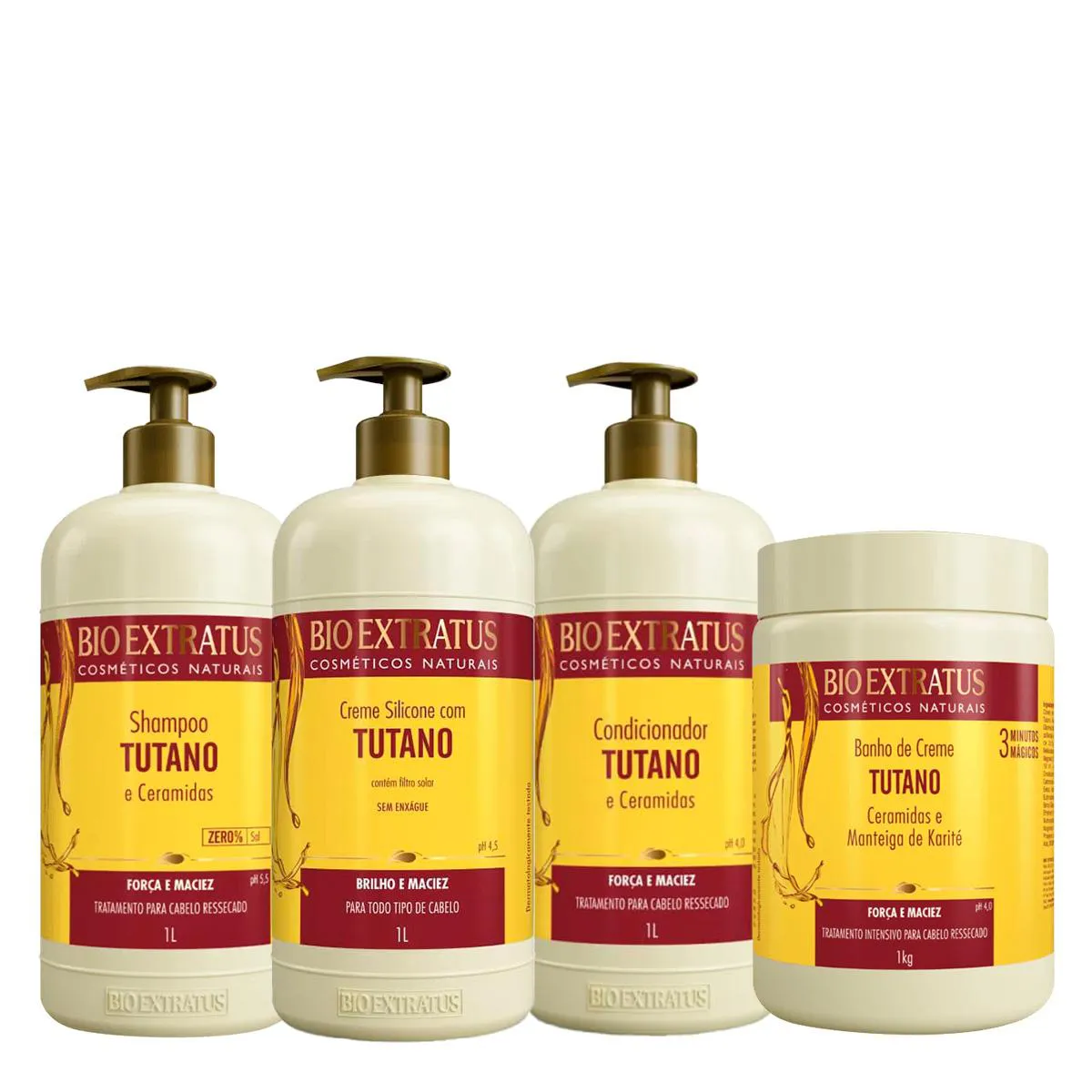 Esse Kit ContémBio Extratus Tutano - Shampoo 1L : limpa suavemente, nutrindo e fortalecendo os fios. realiza uma limpeza suave, nutrindo e hidratando os fios intensamente. Pioneira no uso do tutano em cosméticos capilares, desenvolveu uma linha completa para dar mais força e maciez aos fios secos e ressecados. Bio Extratus Tutano - Condicionador 1L: para cabelos ressecados, limpa com suavidade, nutrir e hidratar intensamente. Pioneira no uso do tutano em cosméticos capilares, a Bio Extratus desenvolveu uma linha completa para dar mais força e maciez. Fórmula equilibrada que condiciona e une as escamas da raiz até as pontas, fortalecendo os fios. Bio Extratus Tutano Ceramidas e Karité - banho de Creme 1 Kg: hidrata, nutre, fortalece e protege, além de ter ação emoliente, o que contribui para redução das pontas duplas. Sua fórmula é pioneira no uso do tutano em cosméticos capilares, protegendo os fios, tornando-os mais saudáveis, macios e brilhantes. Princípios ativos: Karité, previne o ressecamento dos cabelos. Protege das agressões mecânicas e climáticas, inclusive dos raios ultravioleta. Tutano, rico em proteínas, nutre e fortalece profundamente o cabelo. Forma um filme sobre os fios, hidratando e protegendo-os das agressões externas. Ceramidas, restaura os cabelos danificados por condições estressantes, aumenta o brilho, a elasticidade e a resistência dos fios. Silicone, confere brilho, proteção e sedosidade, proporcionando aparência saudável e natural ao cabelo. Queratina Vegetal Catiônica, intenso poder de restauração. Bio Extratus Creme Silicone Tutano - Leave-in 1L: revitaliza, desembaraça, dá brilho e restaura os fios quebradiços. Protege o cabelo contra a ação nociva dos agentes externos, como o sol, poluição, poeira, vento, cloro. pH4,0. Contém filtro solar. Sem enxágue. Conselho de AplicaçãoShampoo: aplique no cabelo molhado, massageando suavemente sem esfregar os fios. Enxágue bem.