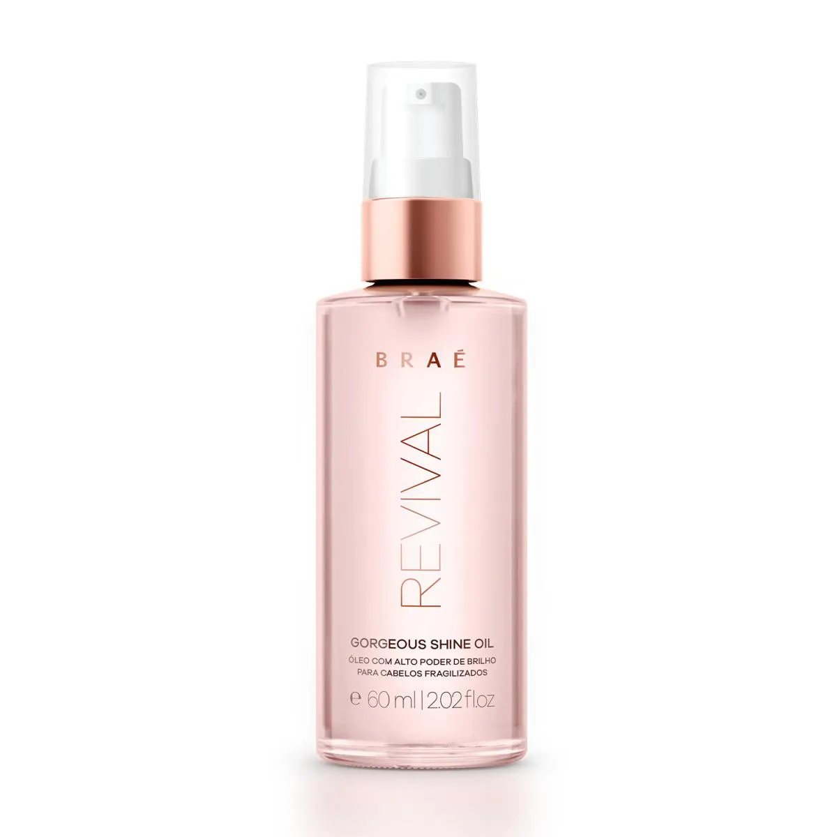 Braé Revival Gorgeous Shine - Óleo Capilar 60ml: nutre e fortalece as pontas, além de devolver a vitalidade aos fios. Repõe os lipídios perdidos e sela os fios para que o cabelo fique brilhante, resistente e disciplinado. Com o uso contínuo, a fórmula ainda previne a formação de pontas duplas.