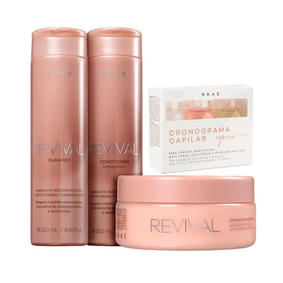 Kit Braé Revival - Shampoo 250ml + Condicionador 250ml + Máscara 200g + Cronograma de Ampolas Repair (3 Ampolas) 13ml