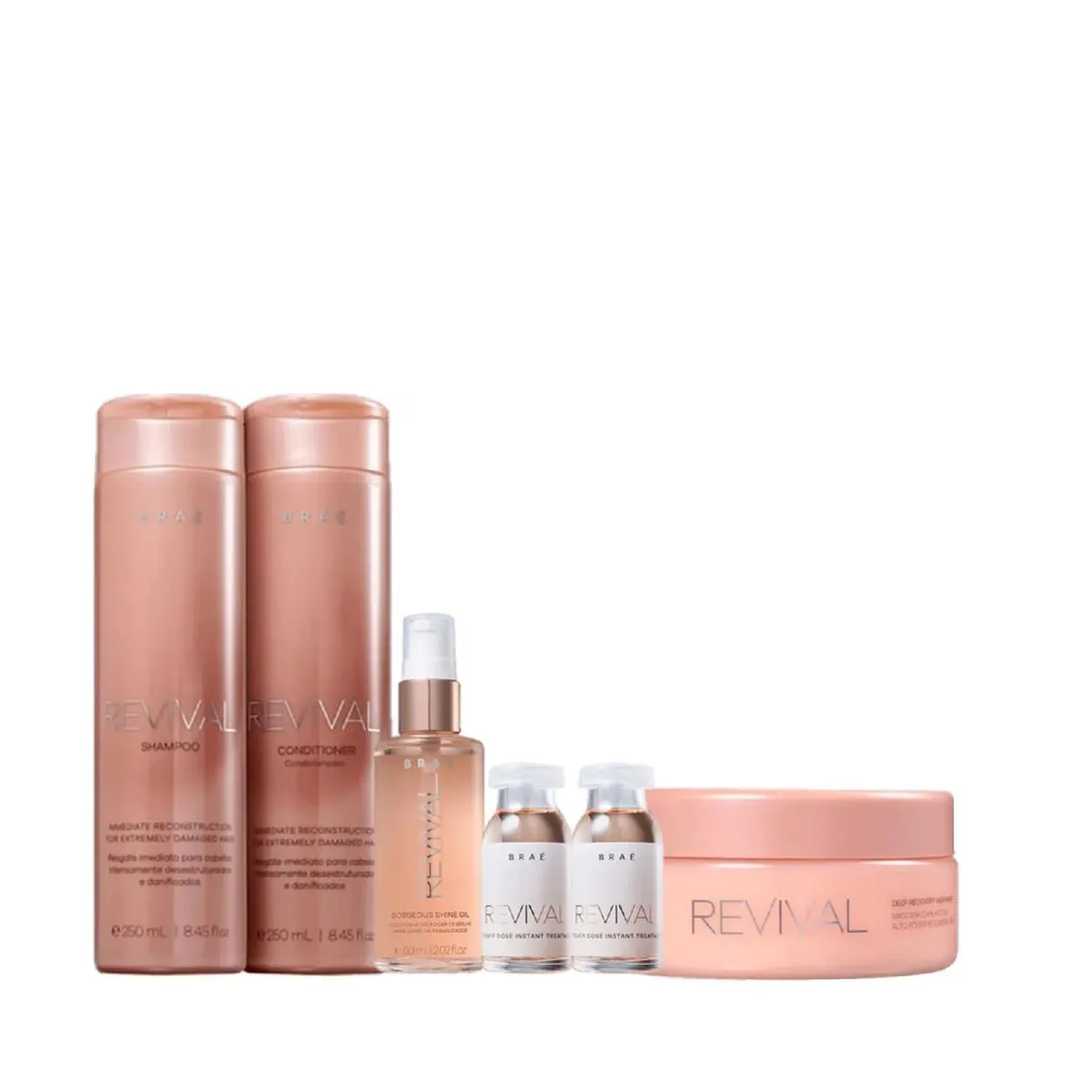 Kit Braé Revival - Shampoo 250ml + Condicionador 250ml + Máscara 200ml + Óleo Gorgeous 60ml + Ampola Revival 13ml (2un)