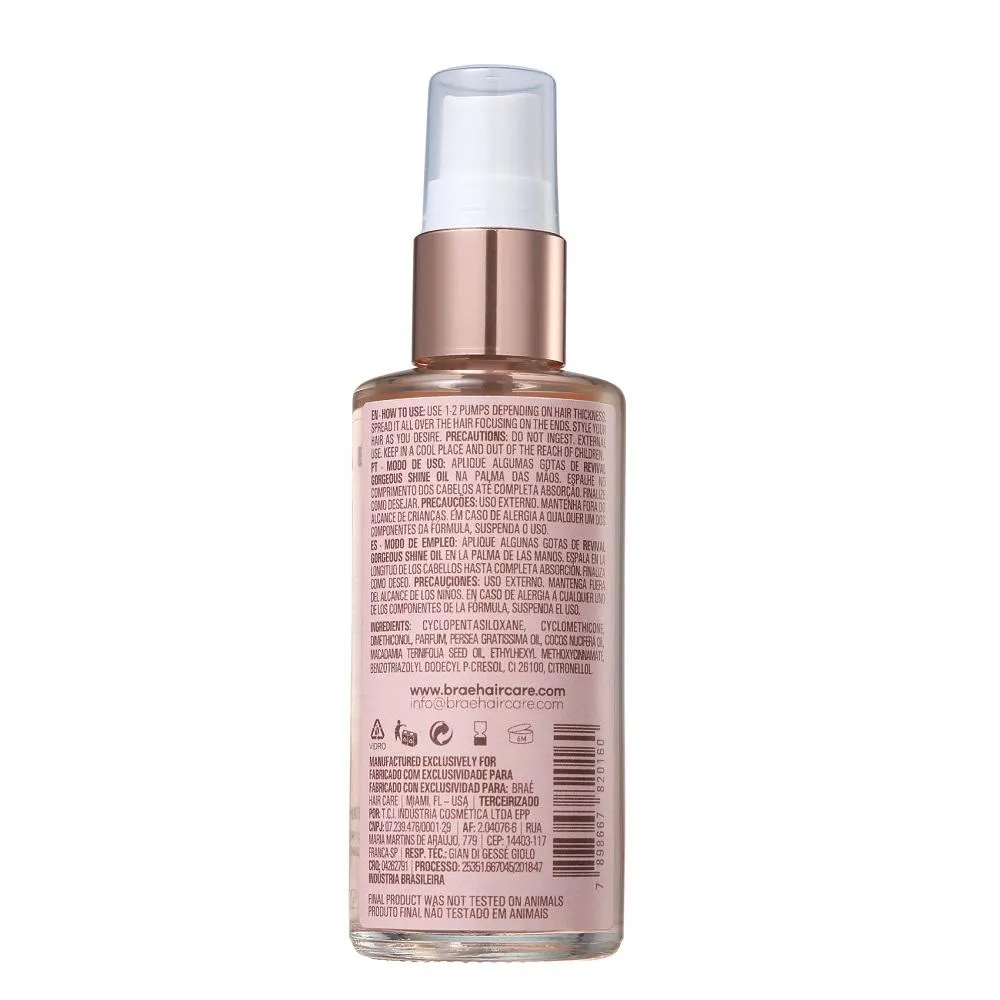 Braé Revival Gorgeous Shine Oil - Óleo Capilar 60ml: possui ação repositora lipídica. Elaborado com óleos de Coco, Abacate e Macadâmia, ele hidrata, nutre, sela e fortalece as pontas ressecadas, promovendo brilho intenso, maciez e vitalidade aos fios. O uso regular do produto previne a formação de pontas duplas.