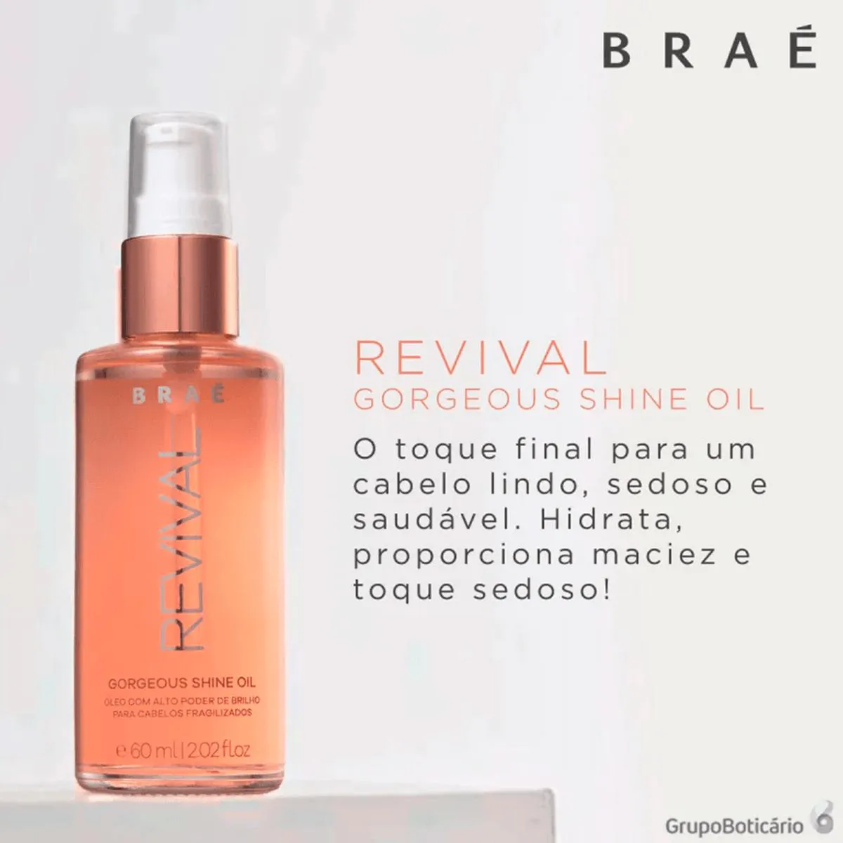 Braé Revival Gorgeous Shine Oil - Óleo Capilar 60ml: para cabelos danificados e fragilizados. Nutre e fortalece as pontas, além de devolver a vitalidade aos fios. Repõe os Lipídios perdidos e sela os fios para que o cabelo fique brilhante, resistente e disciplinado. Com o uso contínuo, a fórmula ainda previne a formação de pontas duplas.