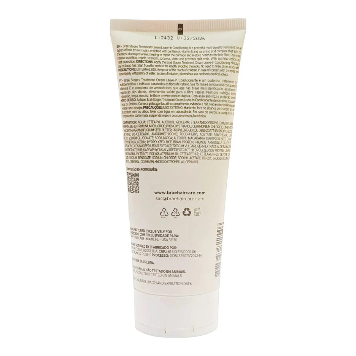 Braé Stages Treatment - Leave-in Creme 200g: feito para todos os tipos de cabelo, este tratamento poderoso de reparação intensa vai direto às áreas mais danificadas, devolvendo a saúde e a vitalidade que seus cabelos precisam. Com ele, você vai sentir seus cabelos mais reparados, macios , sem frizz e com um brilho deslumbrante. Além disso, ele ajuda a prevenir pontas duplas e contém proteção térmica. Perfeito para usar todos os dias!