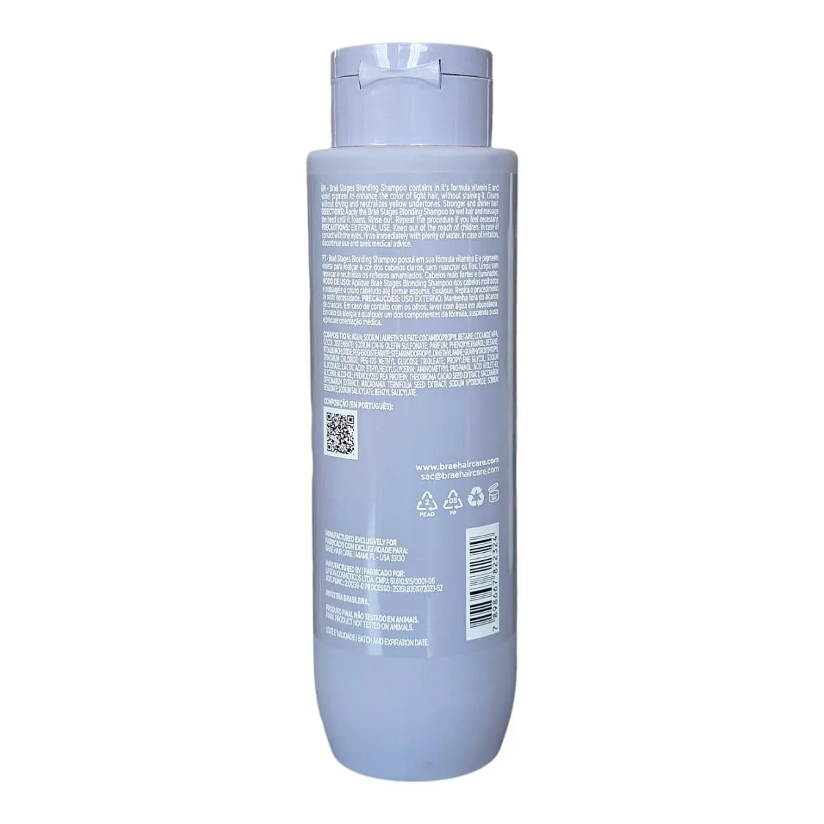 Braé Stages Blonding - shampoo 250ml: para cabelos loiros ou descoloridos. Limpa e trata os fios de forma eficaz, realçando a cor dos cabelos claros. Seu efeito matizador proporciona loiros mais saudáveis, vibrantes e iluminados por mais tempo.
