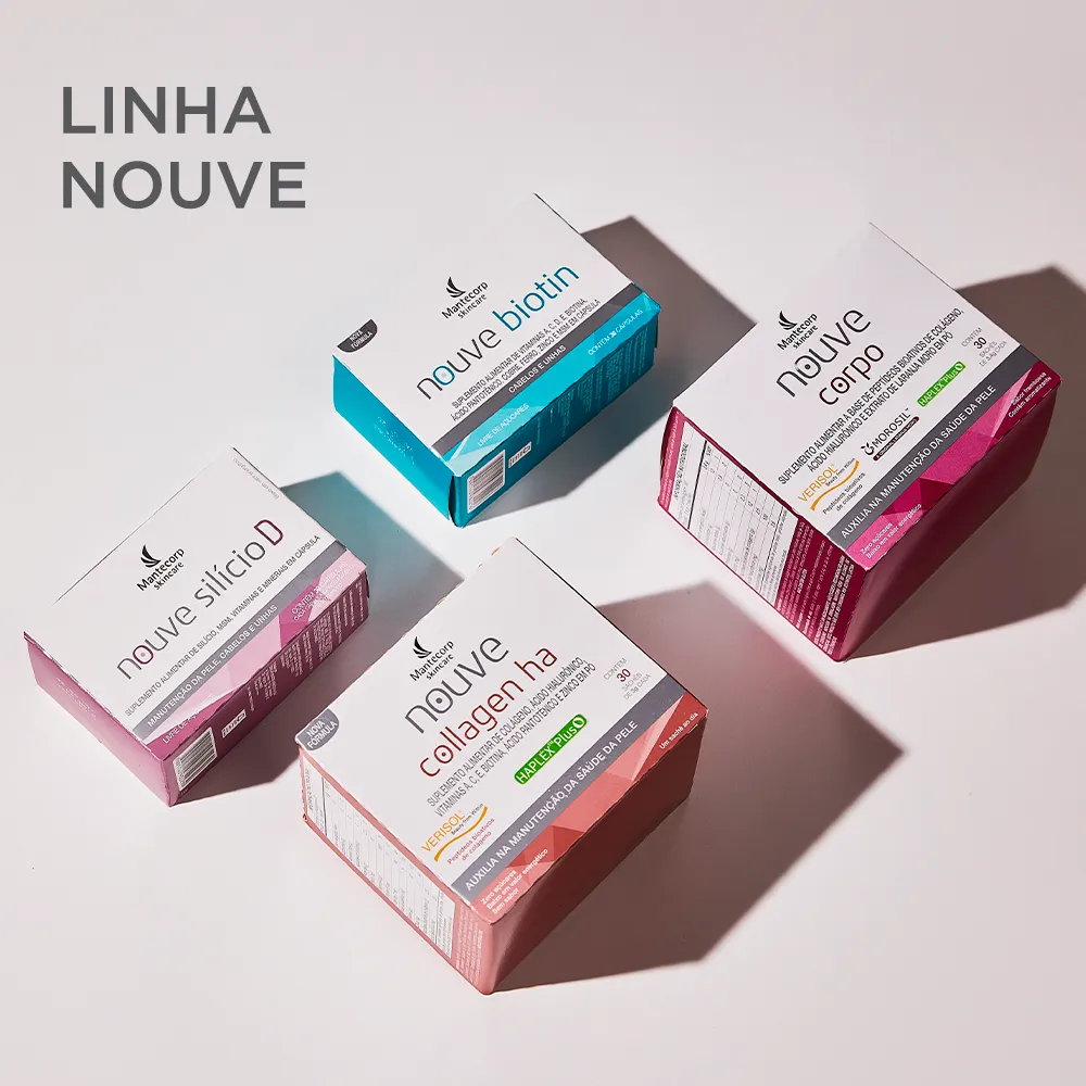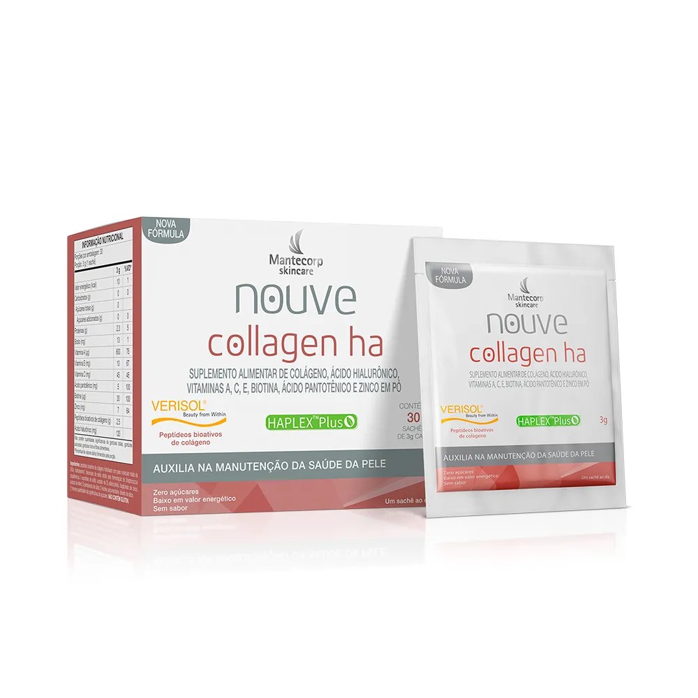 O Kit Com 2 Nouve Collagen Há Nova Fórmula é um suplemento nutricional composto por duas caixas de 30 sachês cada, contendo colágeno VERISOL, ácido hialurônico, vitaminas C, E e zinco. Serve para suplementar o colágeno, melhorar a qualidade da pele, auxiliar na reposição dos componentes estruturais da pele e contribuir na prevenção e combate ao envelhecimento cutâneo.