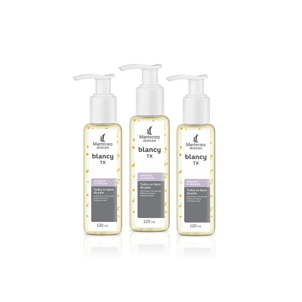 O sabonete clareador Blancy TX é um produto formulado para a limpeza facial das peles que necessitam de uniformização do tom e clareamento. Para isso, a sua fórmula é composta por Ácido Tranexâmico e Niacinamida, ativos que auxiliam no clareamento da pele, KeratolineTM, que promove uma esfoliação suave, eliminando as células mortas e melhorando a textura da pele, e Microesferas Gold encapsuladas de Óleo de Jojoba que, ao serem massageadas, revitalizam e uniformizam a pele revitalizada.Seu uso é indicado para todos os tipos de pele.