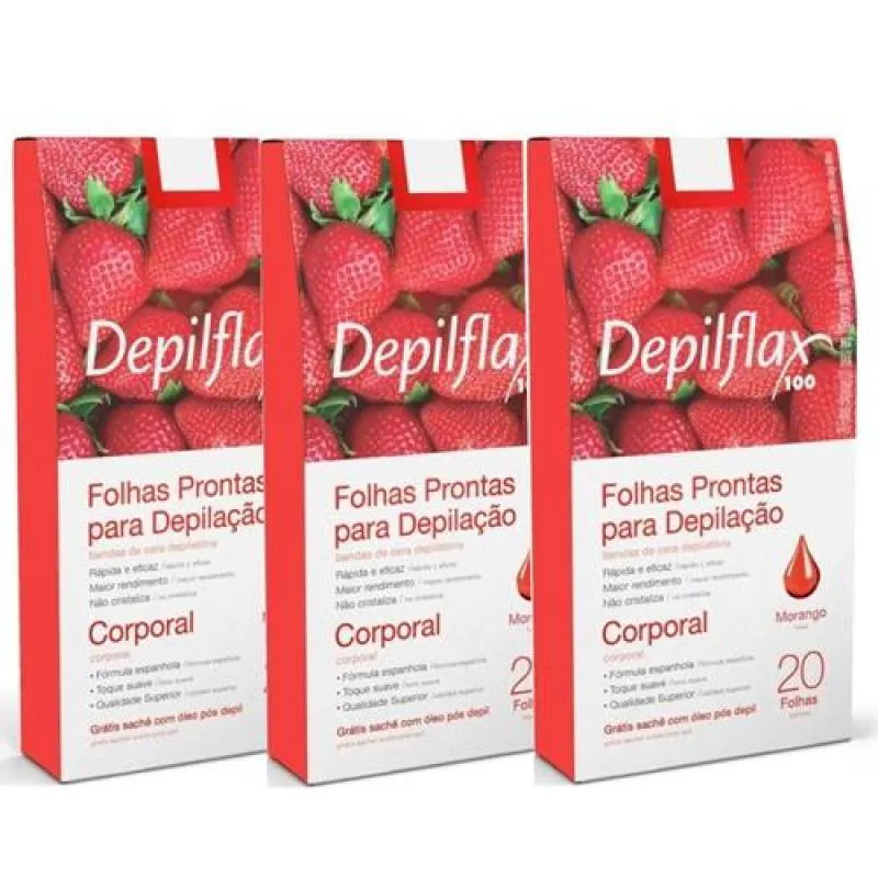 Kit C/ 3 Caixas de Folhas para Depilação Corporal Morango Depilflax C/24 Unid