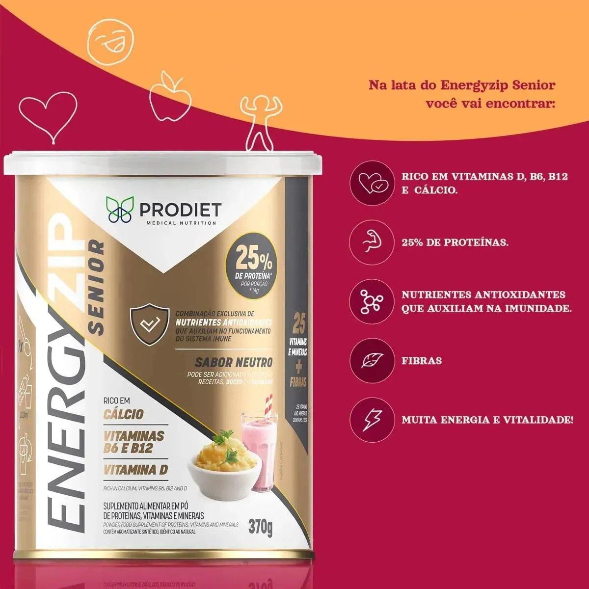 Suplemento nutricional para adultos e idosos com proteínas, fibras, vitaminas e minerais. EnergyZip Sênior Sabor Neutro - Lata 370 gr O Energyzip Senior Sabor Neutro é um suplemento alimentar em pó formulado para complementar a alimentação de adultos e idosos, especialmente acima de 50 anos. Sua composição oferece proteínas de alto valor biológico, fibras, vitaminas e minerais que auxiliam na manutenção da massa muscular, no suporte à saúde óssea, na reposição de energia e no fortalecimento do sistema imunológico. O sabor neutro facilita a inclusão na rotina alimentar, podendo ser misturado em bebidas ou em preparações doces e salgadas, sendo indicado para pessoas com ingestão alimentar insuficiente ou com necessidades nutricionais aumentadas. Advertências Este produto não é medicamento. Não substitui uma alimentação equilibrada e hábitos de vida saudáveis. Produto indicado para adultos. Contém leite e lactose. Pode conter derivados de soja. Conservar em local seco, fresco e ao abrigo da luz. Após aberto, manter a embalagem bem fechada e consumir preferencialmente em até 30 dias.