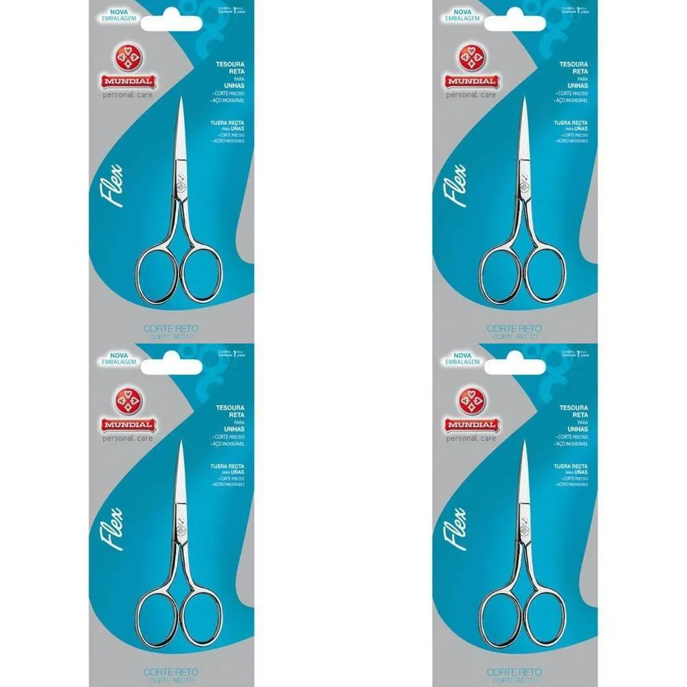Kit c/4 Unidades de Tesoura de unha BC-326 Reta Mundial.    Tesoura de Unha BC-326 Reta Mundial para Unhas Contém: 1 unidade - Tesoura Forjada Reta Aço inoxidável lâminas finas e afiadas com precisão de corte alta durabilidade, anéis com bordas arredondadas para maior conforto. Ideal para o corte reto das unhas e bordados.