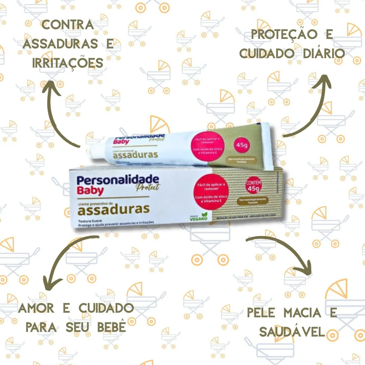 O Creme Baby Preventivo Para Assaduras 45g - Personalidade foi desenvolvido para proteger a pele delicada do bebê contra assaduras, irritações e vermelhidões. Sua fórmula suave cria uma barreira protetora que mantém a pele hidratada e protegida, prevenindo o atrito com a fralda e evitando o desconforto.