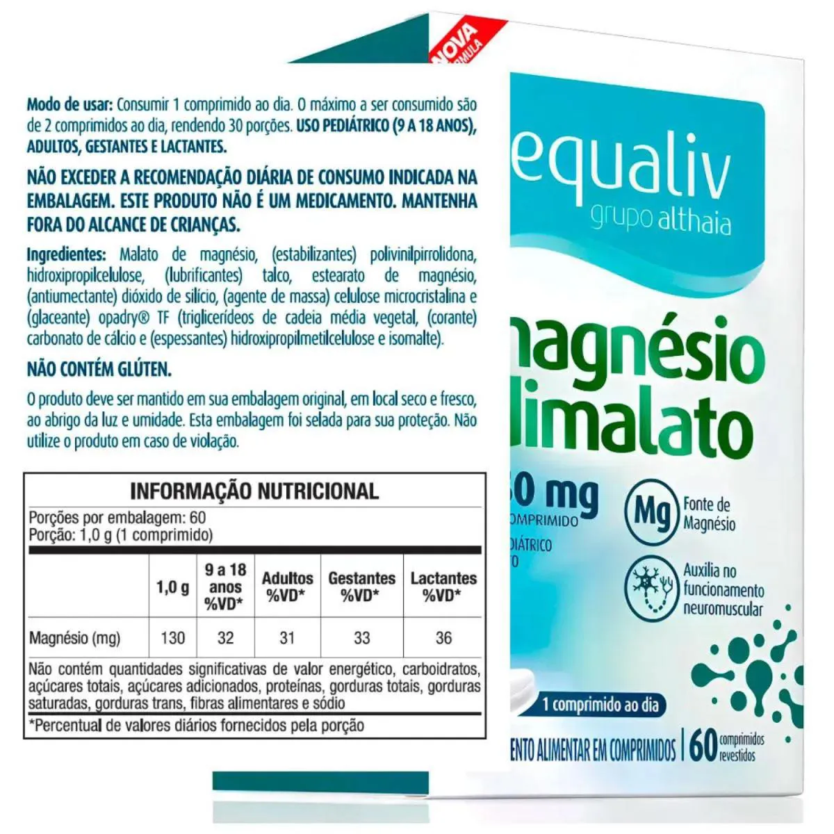O Equaliv Magnésio Dimalato é um suplemento de alta absorção que combina magnésio com ácido málico, auxiliando na produção de energia, no funcionamento muscular e no equilíbrio do sistema nervoso. Ideal para complementar a ingestão diária do mineral e contribuir para mais disposição e bem-estar.