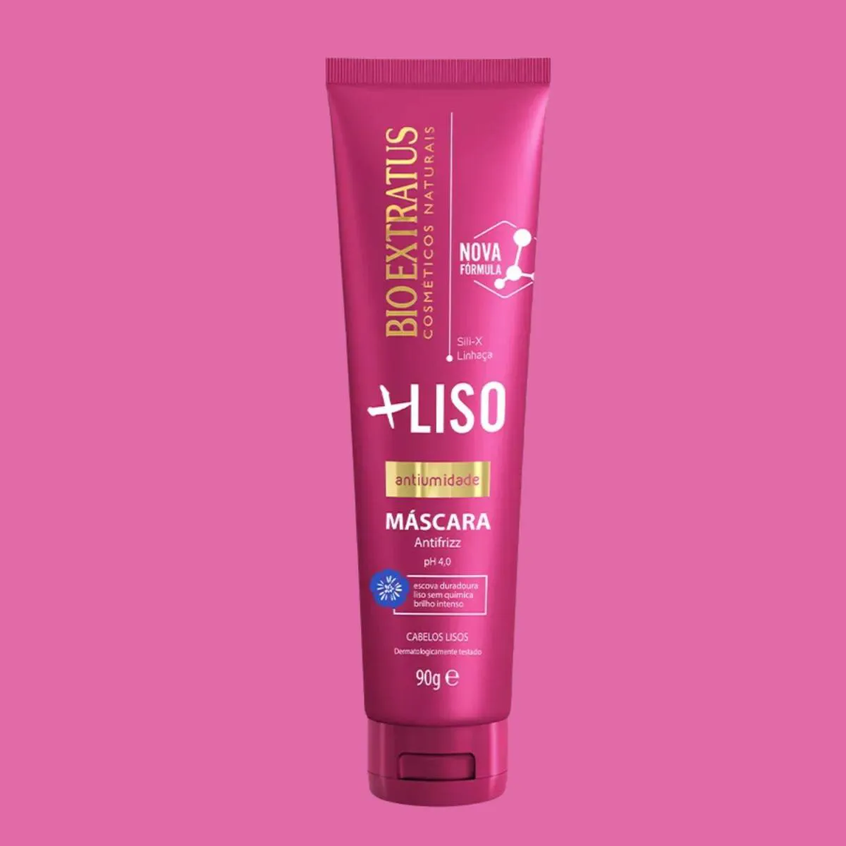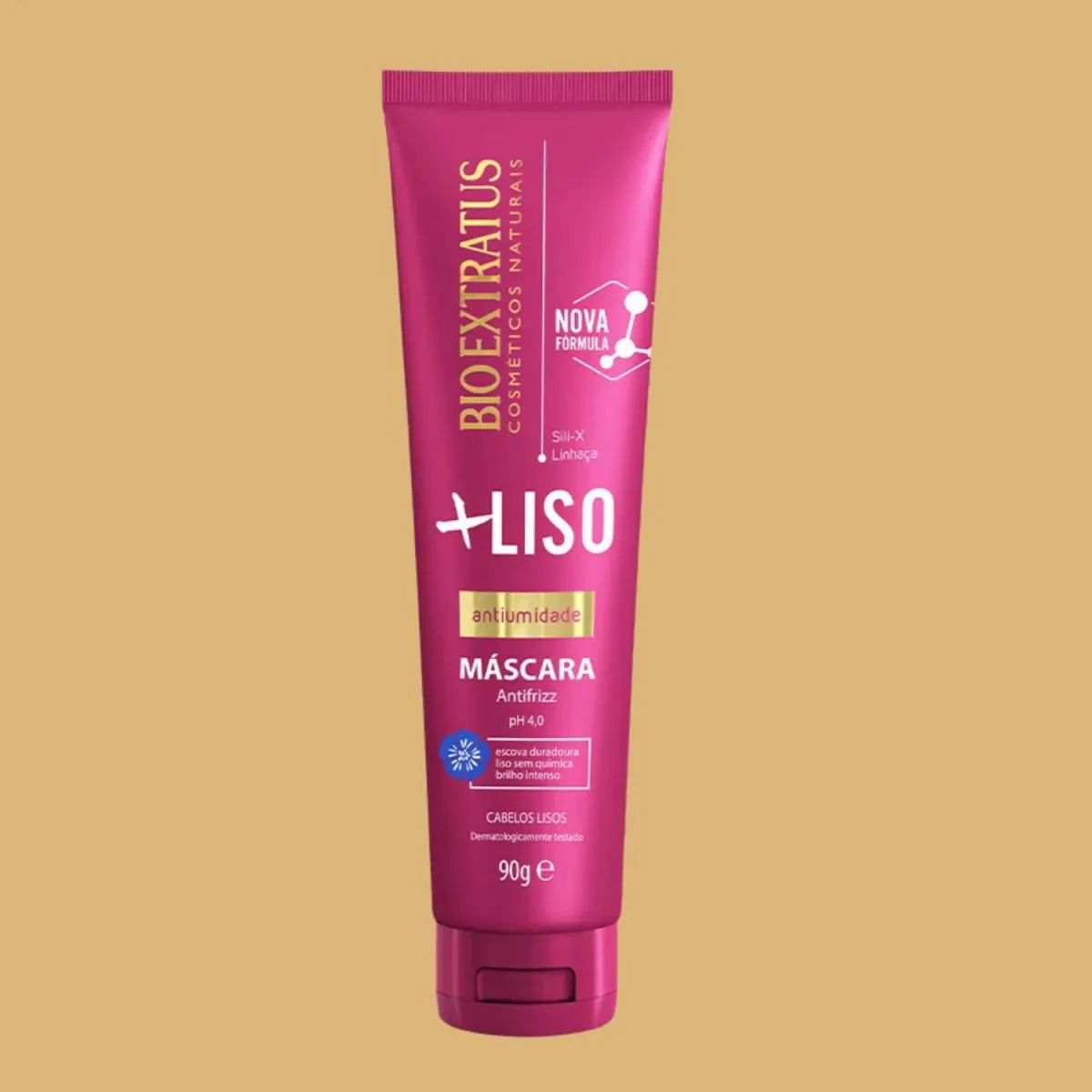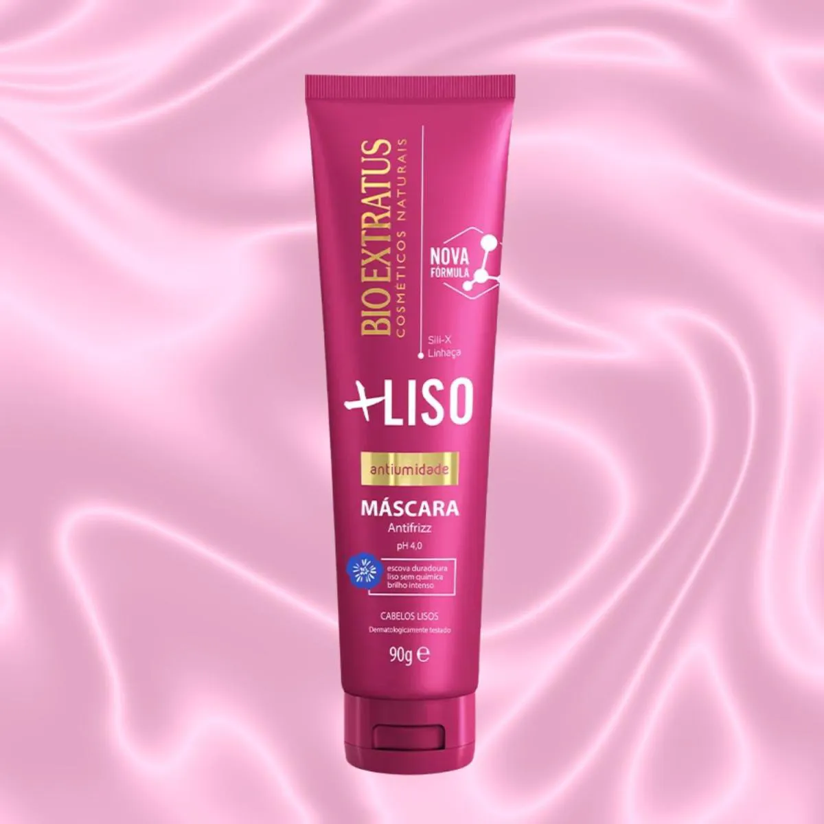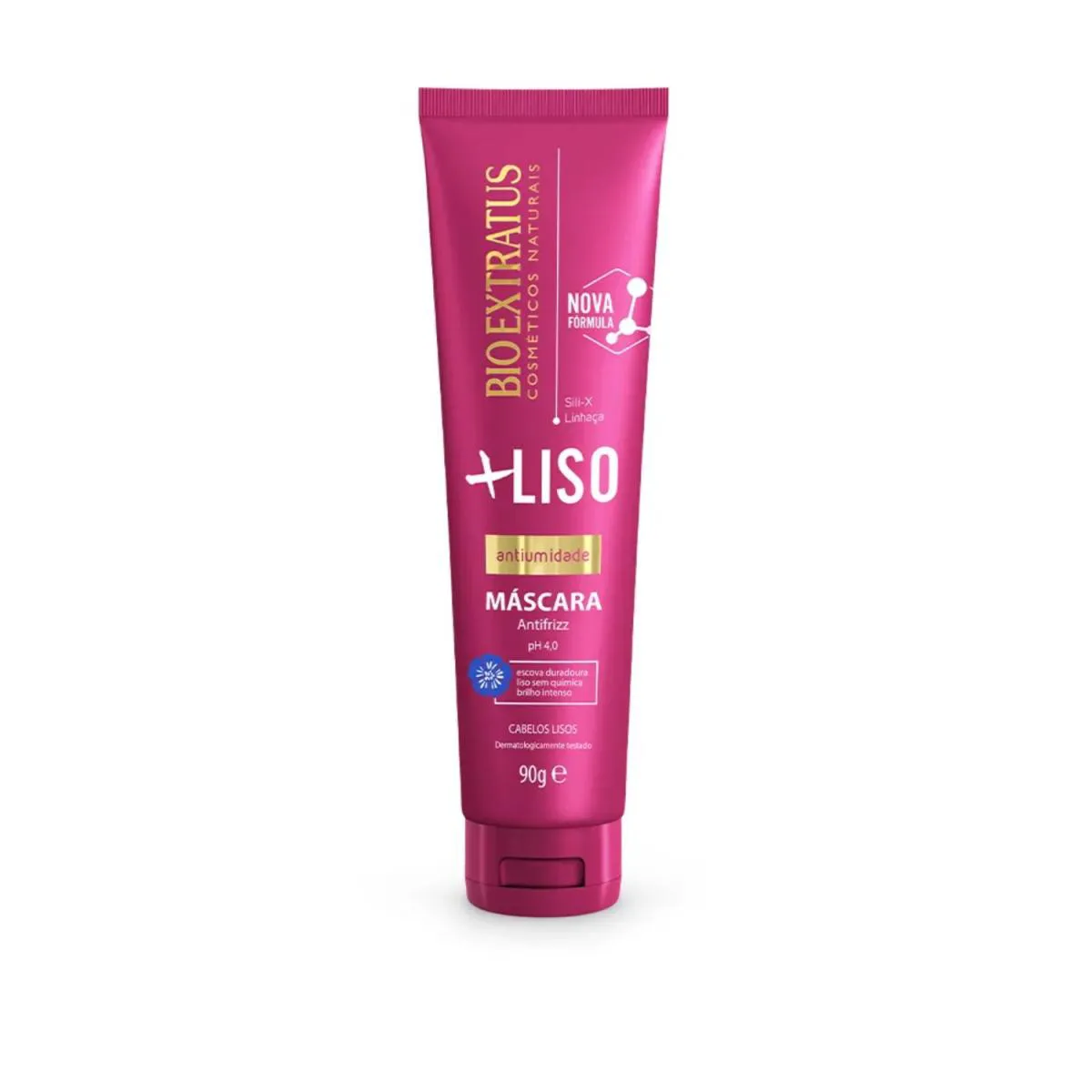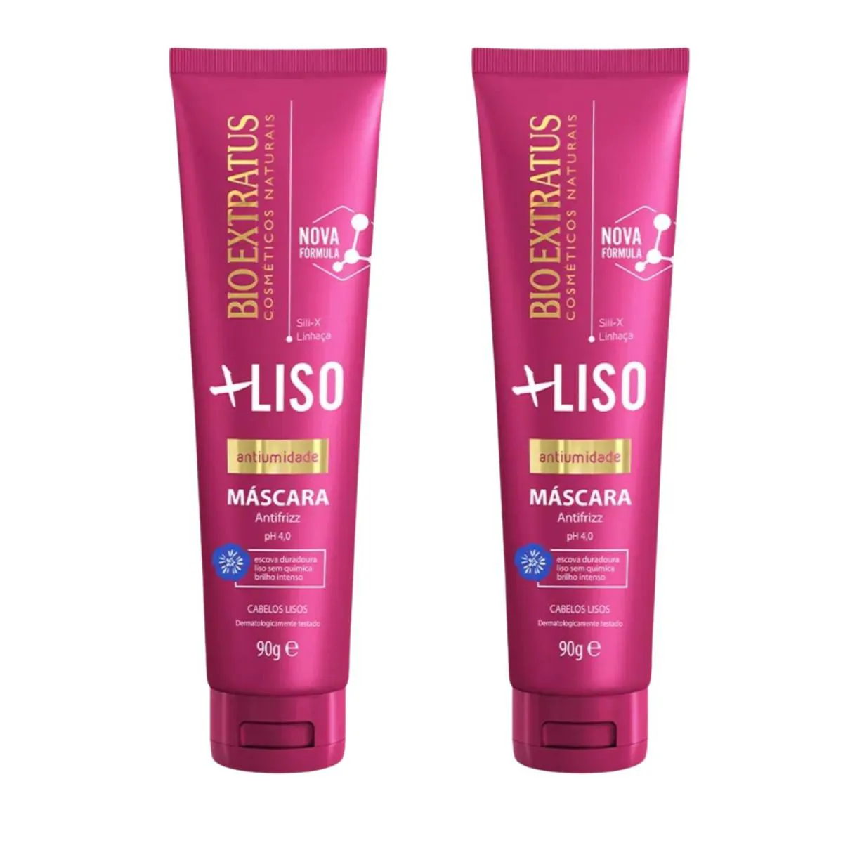 Kit C2 Máscara +Liso Antifrizz 90g – Bio ExtratusNeste Produto está sendo enviado 2(duas) unidades da Máscara +Liso Antifrizz 90gMáscara +Liso Antifrizz 90g – Bio Extratuslisos mais disciplinados, hidratados e com movimento natural! A Máscara +Liso conta com linhaça e um exclusivo ativo antifrizz, que alinha os fios sem química, promove brilho intenso e prolonga o efeito liso mesmo em ambientes úmidos. Ideal para quem busca fios mais suaves ao toque e com menos volume, sem pesar.