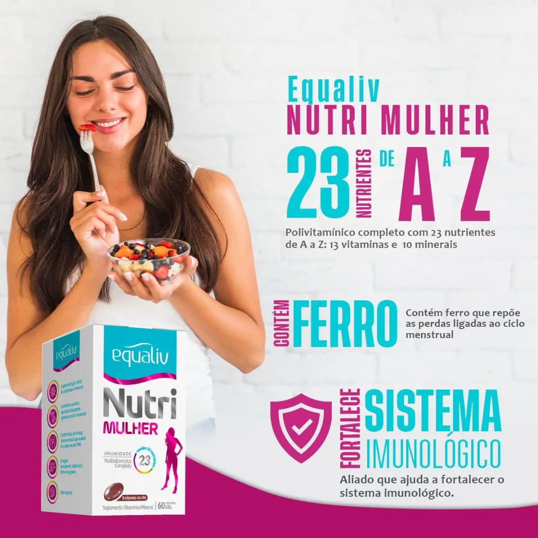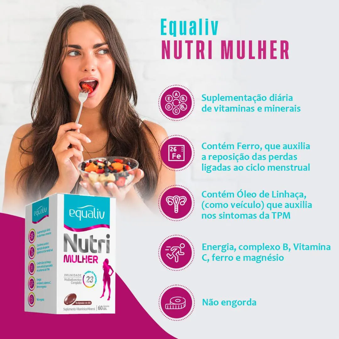 Equaliv Nutri Mulher é um polivitamínico de A a Z com óleo de linhaça, especifico para as necessidades femininas.