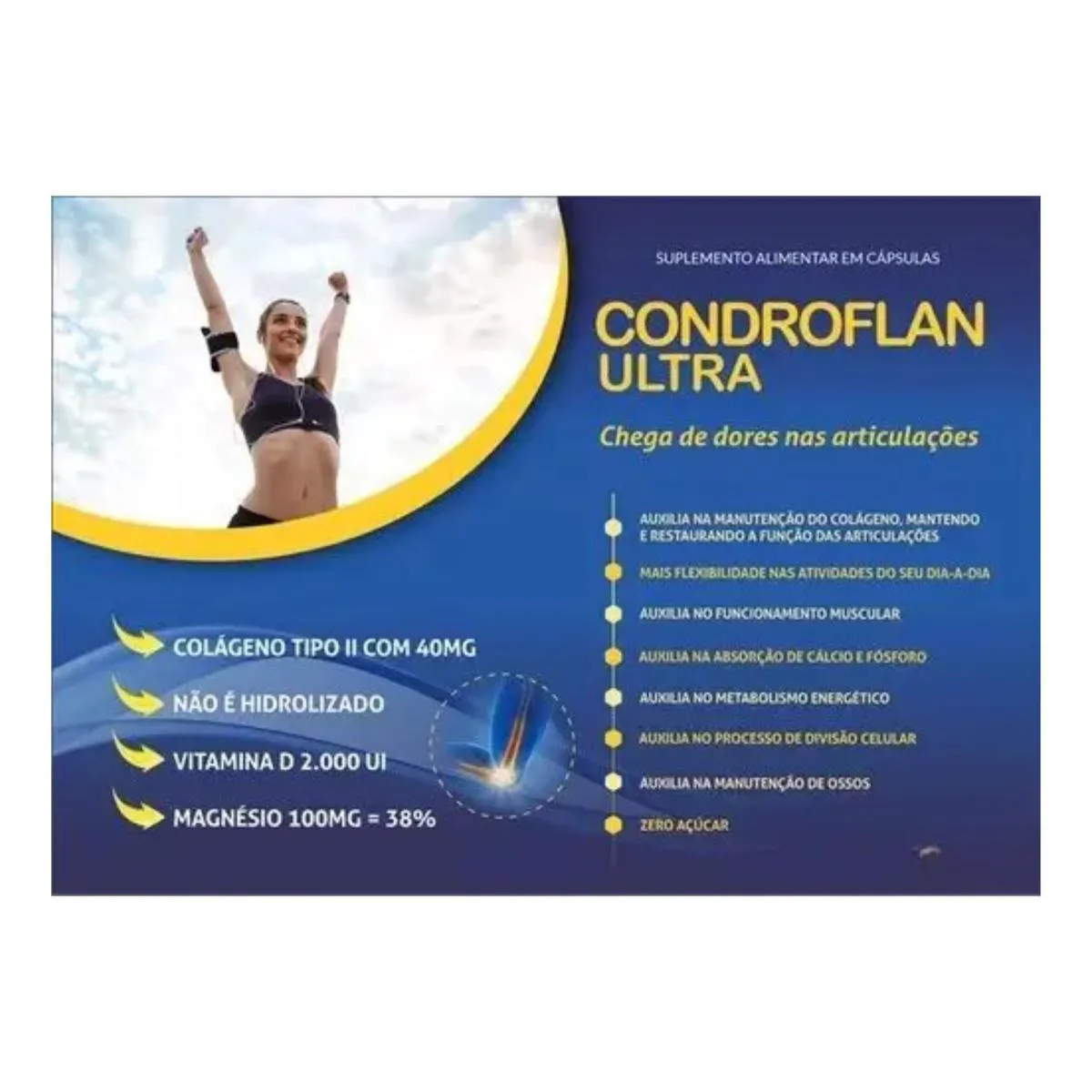 Condroflan Ultra é um suplemento inovador desenvolvido especialmente para promover a saúde e o bem-estar das articulações. Formulado com ingredientes de alta qualidade, como colágeno tipo II, ácido hialurônico, vitamina c e outros nutrientes essenciais, ele atua diretamente na regeneração e proteção das cartilagens. Esse produto é ideal para pessoas que desejam recuperar a mobilidade, aliviar dores articulares e prevenir desgastes causados pelo envelhecimento ou atividades de alto impacto. Condroflan Ultra também é recomendado para atletas e indivíduos que realizam exercícios físicos intensos. Principais características: Auxilia na regeneração das cartilagens; Promover maior flexibilidade e mobilidade articular; Reduz dores e desconforto nas articulações; Previne o desgaste causado pelo envelhecimento; Suporte para atividades físicas intensas. Sugestão de uso: Ingerir 01 cápsula ao dia pela manhã. Com Condroflan Ultra, você cuida das suas articulações e mantém uma vida mais ativa e saudável! Imagens meramente ilustrativas. Todas as Informações Divulgadas são de Responsabilidades Exclusivas do Fabricante / fornecedor.