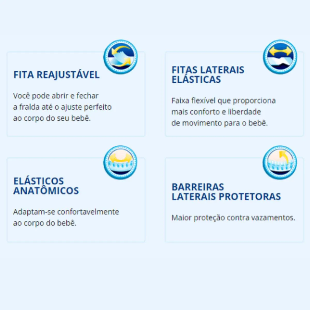 Além disso, possuem fita reajustável, que permite abrir e fechar a fralda quantas vezes necessário, garantindo o encaixe perfeito sem danificar o produto.
