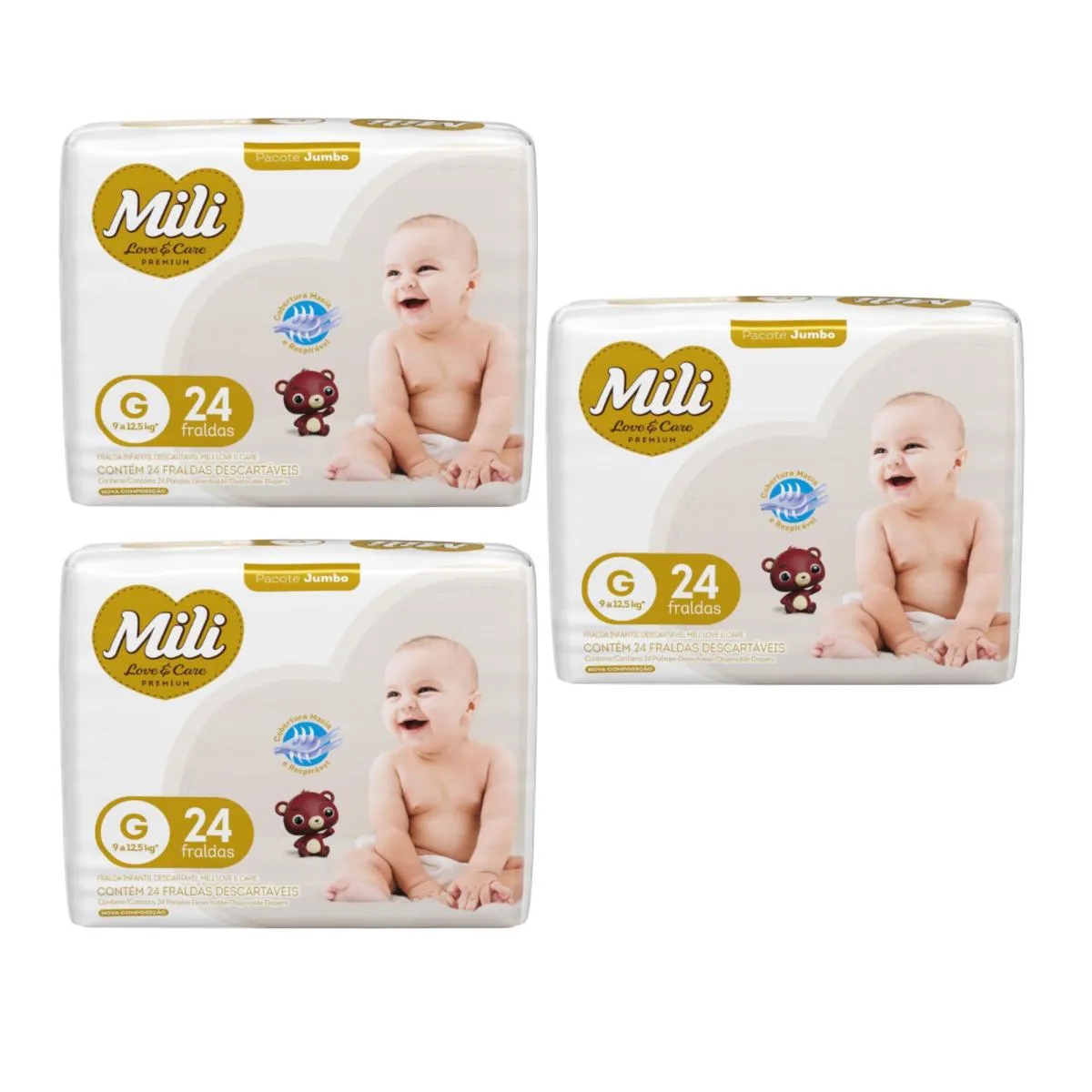 Kit C3 fralda Love & Care Jumbo G C/24 - MiliFralda Mili Ultra Seca: Proteção que Acompanha o Crescimento do Seu Bebê