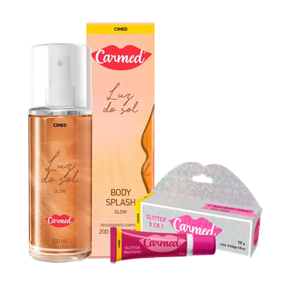 Kit Carmed Body Splash Luz do Sol Glow 200ml + Hidratante Labial Multiuso Glitter 3 em 1 Rosa Holográfico 10g