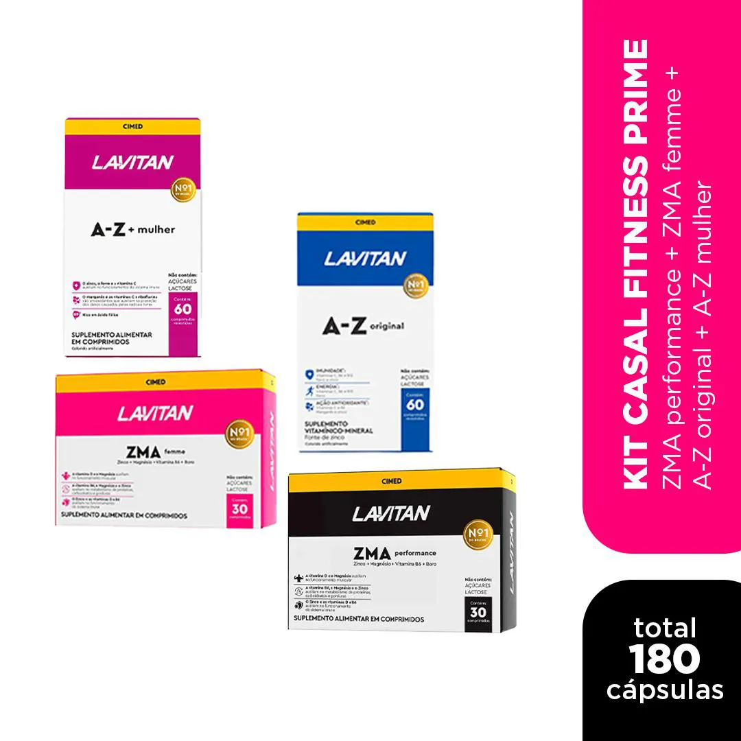 O Kit Casal Fitness Prime da Cimed foi pensado para quem busca praticidade e equilíbrio na rotina de suplementação do casal. Ele reúne quatro produtos da linha Lavitan — ZMA Performance, ZMA Femme, Lavitan A-Z Original e Lavitan A-Z Mulher — totalizando 180 cápsulas.
