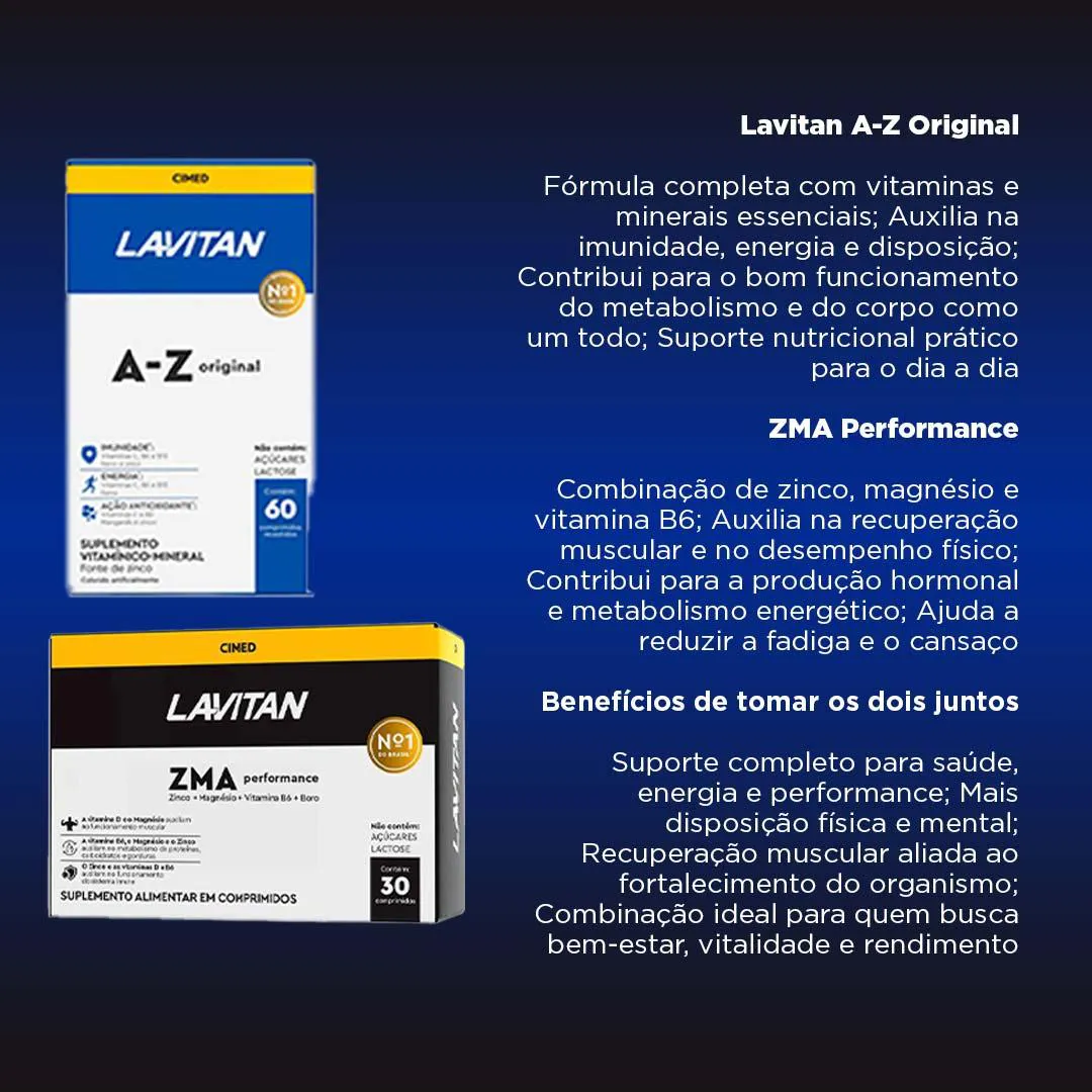 O ZMA Performance e o ZMA Femme combinam zinco, magnésio e vitamina B6, micronutrientes importantes para o metabolismo energético e o funcionamento muscular. Já os multivitamínicos Lavitan A-Z Original e Lavitan A-Z Mulher oferecem um amplo espectro de vitaminas e minerais que auxiliam na manutenção das funções corporais e complementam a alimentação.