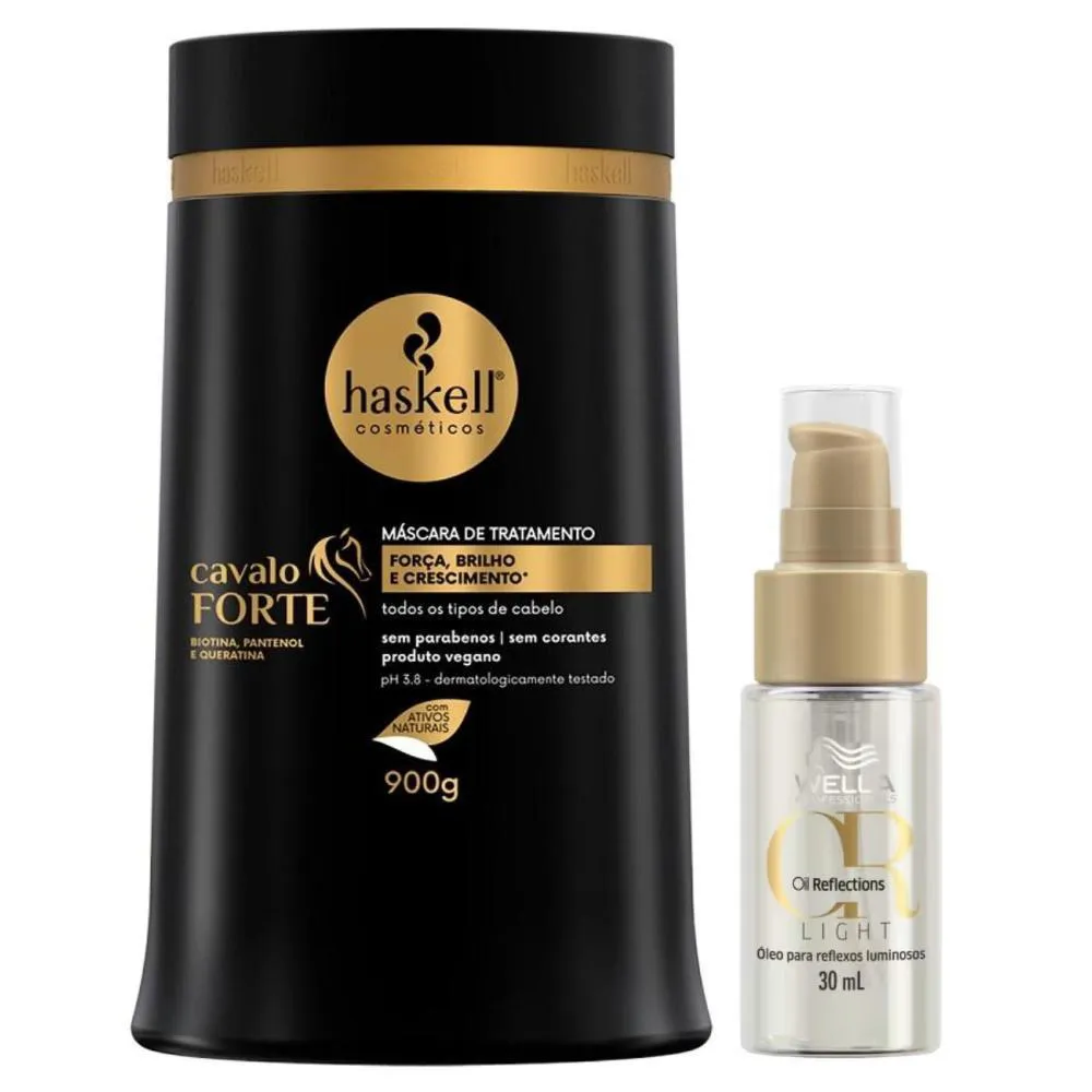 Força, nutrição e vitalidade para cabelos fracos, quebradiços ou sensibilizados, reunindo tratamento intensivo e toque leve para fios mais resistentes, hidratados e com brilho saudável desde as primeiras aplicações.Sua fórmula da Máscara Haskell Cavalo Forte 900g é enriquecida com ativos tradicionalmente utilizados para reforçar a fibra capilar, promovendo reconstrução da estrutura interna, reposição de nutrientes e condicionamento profundo que ajudam a reduzir a quebra e aumentar a resistência dos fios, deixando-os mais encorpados e disciplinados.O Óleo Wella Light Oil Reflections 30ml complementa o tratamento com nutrição leve e brilho radiante, ideal para finalizar sem pesar os fios. Formulado com óleo de semente de camélia e extrato de chá branco, proporciona maciez, controle de frizz e toque sedoso, além de oferecer proteção térmica e sensorial sofisticado.Indicado para quem busca fortalecer e restaurar a saúde dos fios no Cronograma Capilar, este kit combina a potência de um tratamento nutritivo intenso com a leveza de um óleo finalizador que realça o brilho e a suavidade dos cabelos.
