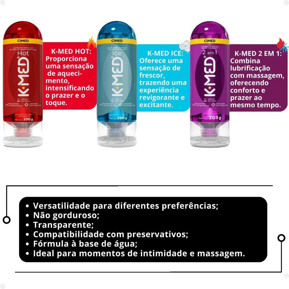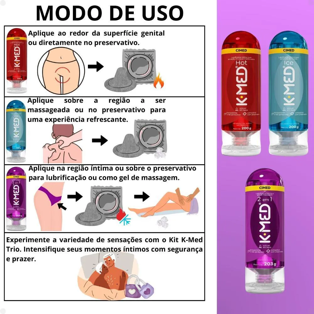 Kit lubrificantes K-Med Trio: Hot, Ice e 2 em 1 200g Contém: - 01 K-Med 2 em 1 200g - 01 K-Med Hot 200g - 01 K-Med Ice 200g . O Kit Lubrificantes K-Med Trio: Hot, Ice e 2 em 1 50g é uma opção completa para quem busca intensificar as sensações durante momentos íntimos. Este kit inclui três tipos de lubrificantes, cada um com características e efeitos especiais: Hot: Proporciona uma sensação de aquecimento, intensificando o prazer e o toque. Ice: Oferece uma sensação de frescor, trazendo uma experiência revigorante e excitante. 2 em 1: Combina os benefícios de lubrificação com massagem, oferecendo conforto e prazer ao mesmo tempo. Com embalagens práticas de 50g, os lubrificantes são ideais para uso pessoal ou em casal, oferecendo opções variadas para atender diferentes preferências. Sua fórmula é compatível com o uso de preservativos e garante prazer e conforto durante o uso. O Kit Lubrificantes K-Med Trio é perfeito para quem deseja explorar novas sensações e tornar os momentos de intimidade ainda mais intensos e agradáveis. . Modo de usar: K-Med 2 em 1: Pode ser utilizado durante a relação sexual ou quando houver necessidade de lubrificação íntima adicional. O produto não danifica o látex podendo ser aplicado sobre o preservativo ou na região genital a ser lubrificada tanto em homens como em mulheres. Não há restrição de uso em relação à frequência e a quantidade de produto, podendo ser utilizado sempre que desejado. Como Gel de Massagem: Aplicar sobre a região a ser massageada sempre que necessário. Não há restrição de uso em relação à frequência e a quantidade do produto, podendo ser utilizado sempre que desejado. K-Med Hot: Pode ser aplicado ao redor da superfícice da vaginam diretamente no orgão genital ou no preservativo. Uso com preservativo: Colocar o preservativo e em seguida aplicar o K-Med Hot sobre o preservativo ou diretamente na área a ser lubrificada. K-Med Ice: Aplique sobre a região a ser massageada sempre que necessário. Pode ser utilizado durante a relação sexual ou quando houver necessidade de lubrificação íntima adicional. Uso com preservativo: Colocar o preservativo e em seguida, aplicar o K-Med Ice sobre o preservativo ou diretamente na área a ser lubrificada . Precauções: Não aplique sobre a pele irritada ou ferida. Em casos de irritação, suspenda o uso. Manter fora do alcance das crianças. Não utilizar durante a gravidez. Evitar contato com os olhos. Em caso de sinais de sintomar de intoxicação, suspender o uso e procurar orientação médica. Não use os produtos fora do prazo de validade. K-Med Hot e K-Med Ice são compatíveis com látex, podendo ser utilizados diretamente no preservativo. K-Med 2 em 1 não é contraceptivo e não contém nenhum espermicida. . Perguntas Frequentes O que vem no Kit Lubrificantes K-Med Trio? O kit inclui três lubrificantes de 50g cada: Hot, que proporciona sensação de aquecimento; Ice, que oferece frescor; e 2 em 1, que combina lubrificação e massagem. Posso usar os lubrificantes K-Med Trio com brinquedos íntimos? Sim, os lubrificantes K-Med Trio são adequados para uso com brinquedos íntimos, mas é importante verificar as recomendações de uso específicas para cada tipo de brinquedo. Os lubrificantes K-Med são à base de água? Sim, os lubrificantes K-Med são à base de água, o que os torna fáceis de limpar e seguros para o uso com preservativos. O Kit Lubrificantes K-Med Trio é indicado para pessoas com pele sensível? Sim, os lubrificantes são formulados para ser seguros e suaves para a pele. Porém, se você tem pele sensível ou alergias, é recomendado fazer um teste em uma pequena área da pele antes de usar. . Notificação ANVISA K-Med 2 em 1: 1.04381.00005 K-Med Hot: 1.04381.00003 K-Med Ice: 8.13136.39001