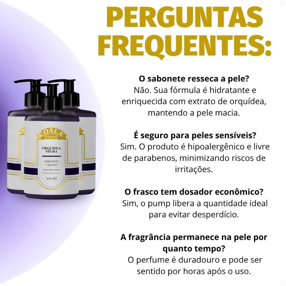 Apresenta uma fragrância exclusiva de Orquídea Negra, cuidadosamente elaborada para conferir um toque de luxo, distinção e sofisticação incomparáveis.É um produto hipoalergênico, o que minimiza significativamente os riscos de alergias, irritações e desconfortos na pele.Sua fórmula é totalmente livre de parabenos, garantindo um cuidado mais natural, seguro e suave para a sua pele, sem comprometer a eficácia da limpeza.É enriquecido com extrato de orquídea, um ingrediente conhecido por suas excepcionais propriedades emolientes, hidratantes e revitalizantes para a pele.Ocasiões de Uso/Cenários Ideais