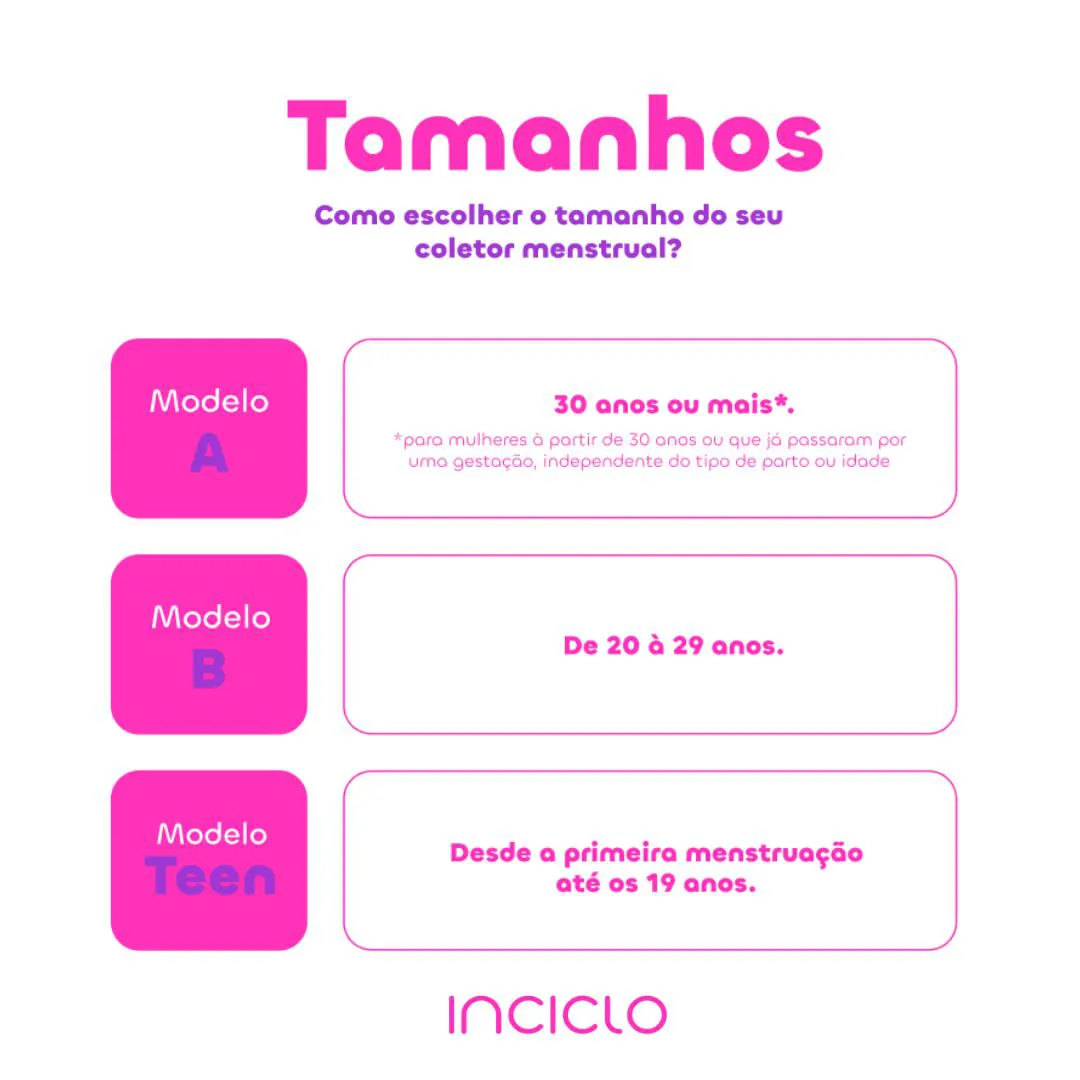 A Inciclo oferece três modelos de coletor para se adaptar perfeitamente às suas necessidades. O disco menstrual possui tamanho único.- Coletor Modelo A: Ideal para mulheres com mais de 30 anos e/ou para quem já teve algum tipo de parto.