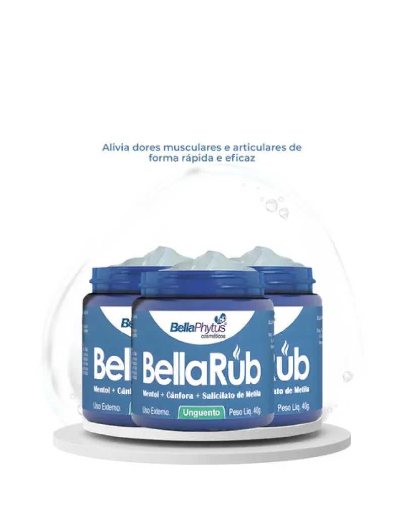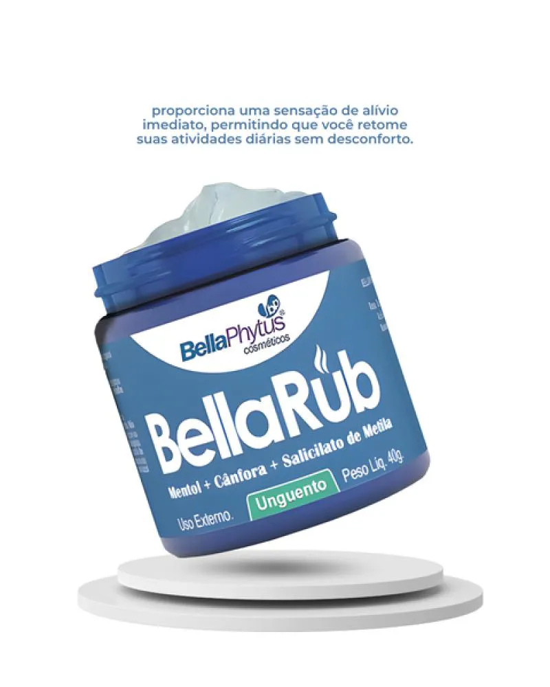 BellaRub 40g BellaRub é uma pomada massageadora com ativos como; Mentol, Cânfora e Salicilato de Metila que proporcionam alívio e conforto, para ser aplicada no peito, pescoço e costas. Precauções:- Uso adulto.- Suspenda o uso em caso de irritação e procure orientação médica.- Conservar em local seco e arejado, ao abrigo de luz solar direta, fogo e outras fontes de calor.- Mantenha a embalagem fechada.- Armazenar fora do alcance de crianças.